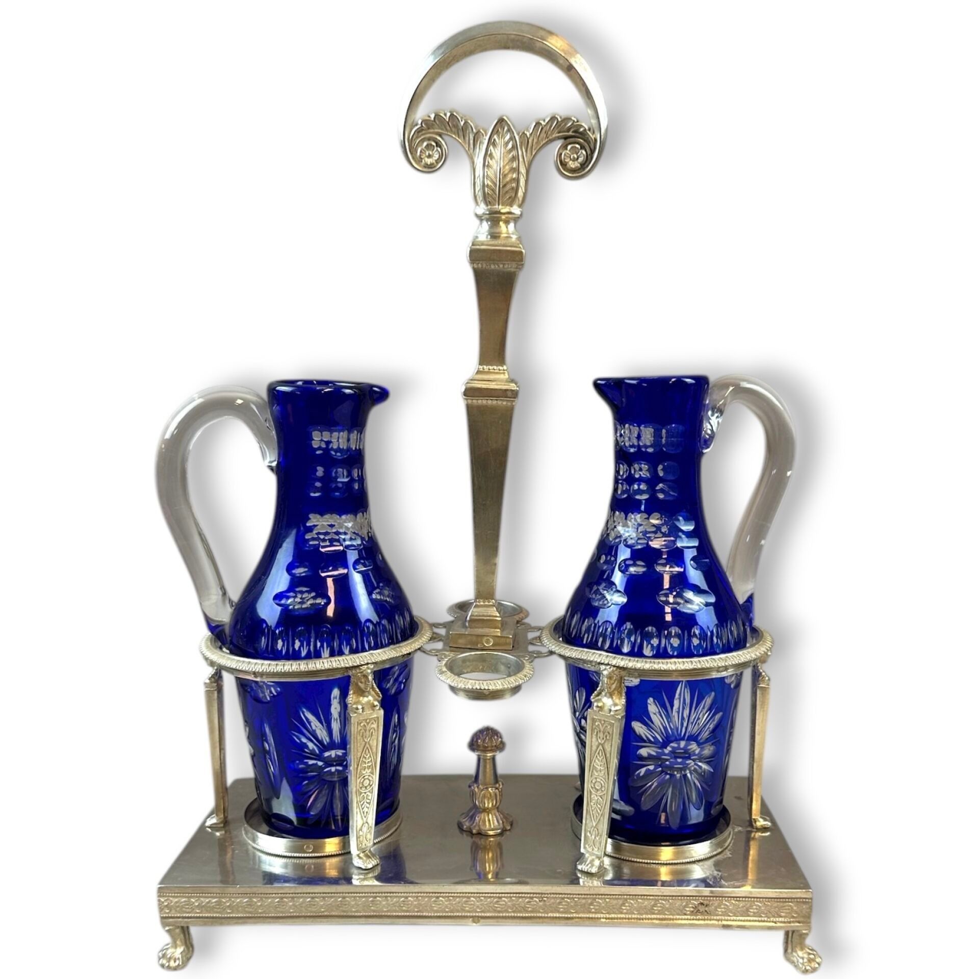 A silver oil and vinegar cruet with a rectangular cross-section, chased with friezes of water leaves, foliage and palmettes.