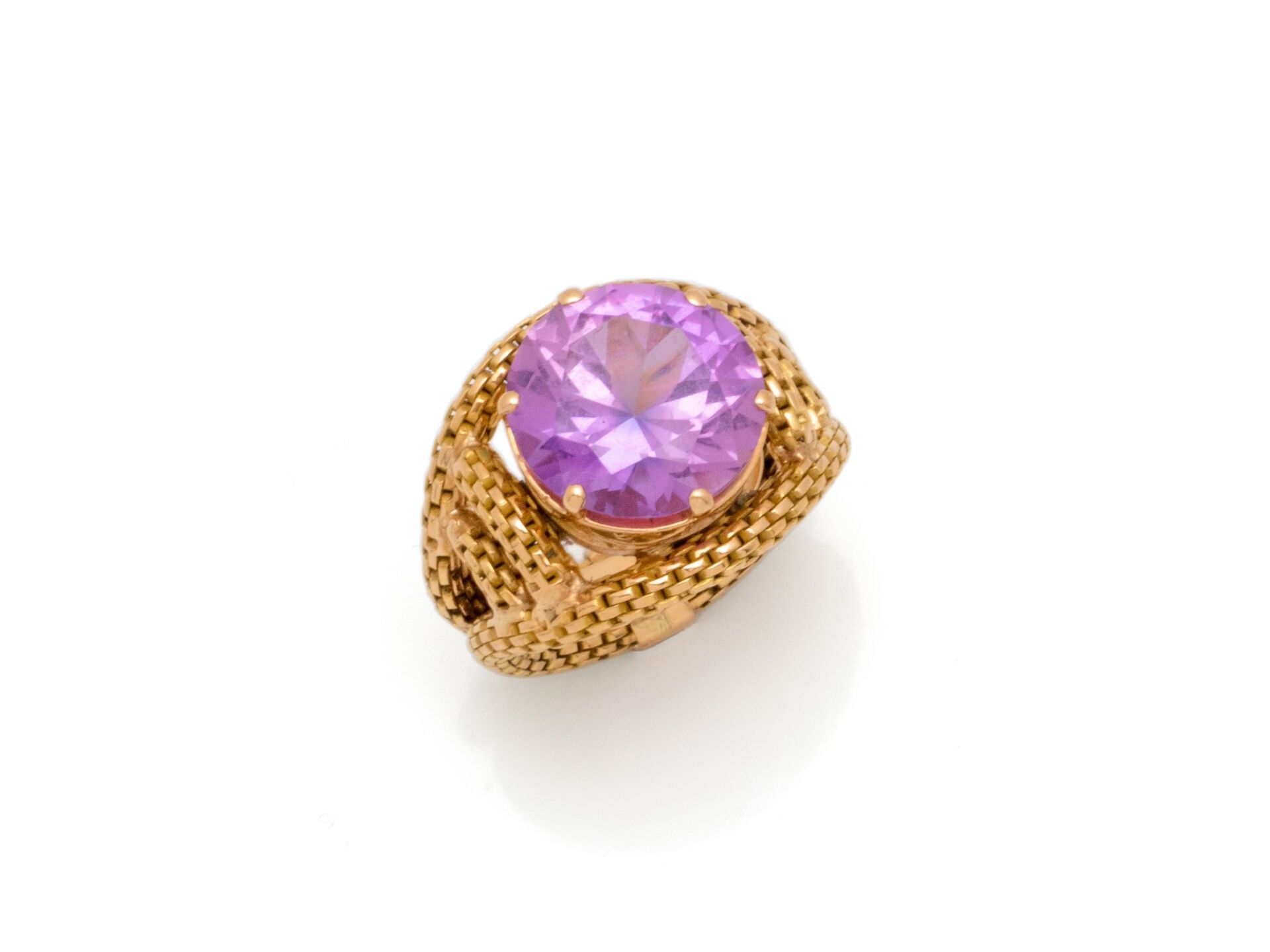 Ring in 750 thousandths gold, the setting composed of 2 flexible strands of snake chain set with a violet stone. The round bezel is finely pierced.