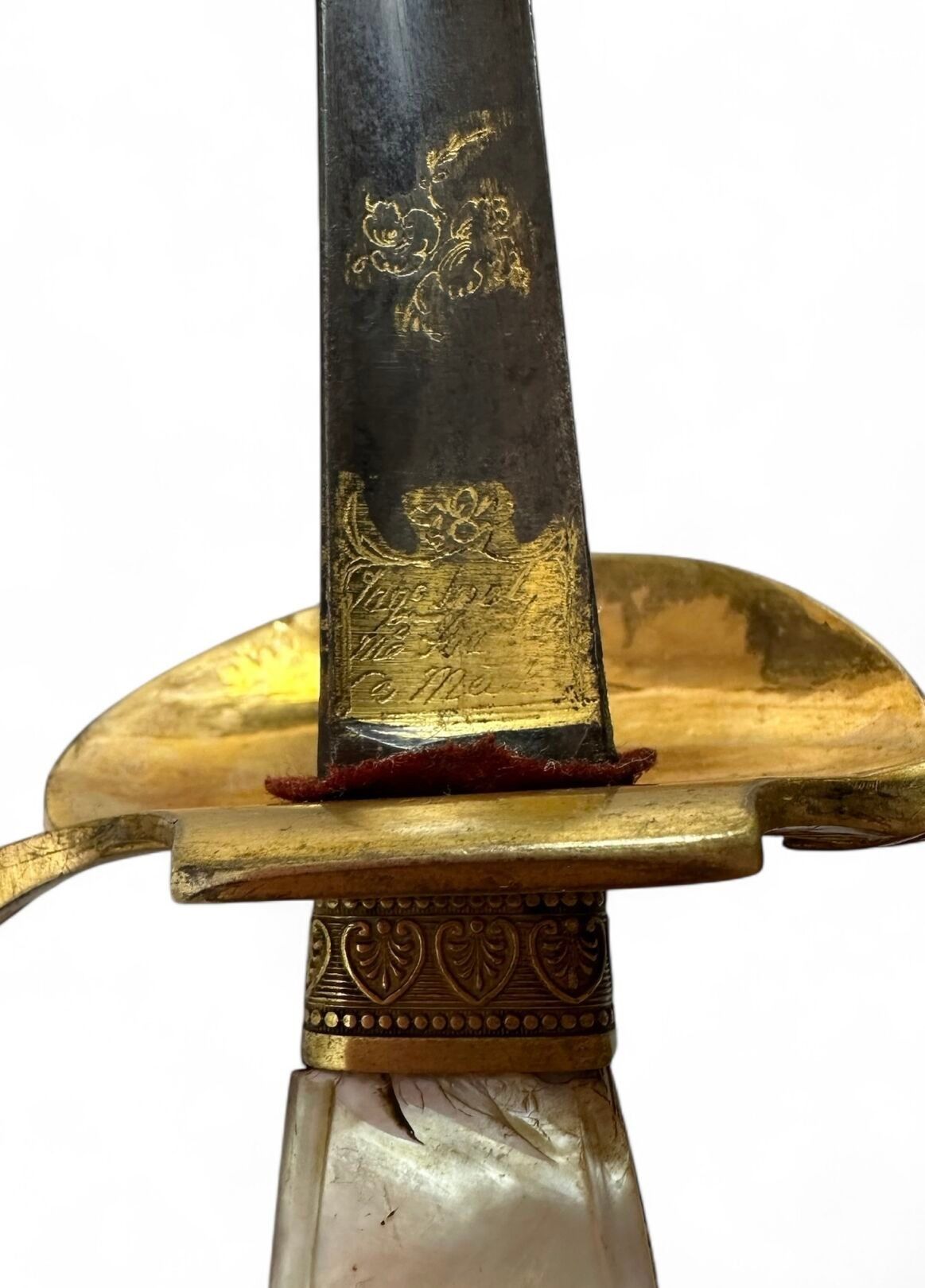 Gilt brass handle and guard, pair of mother-of-pearl plates with chips.