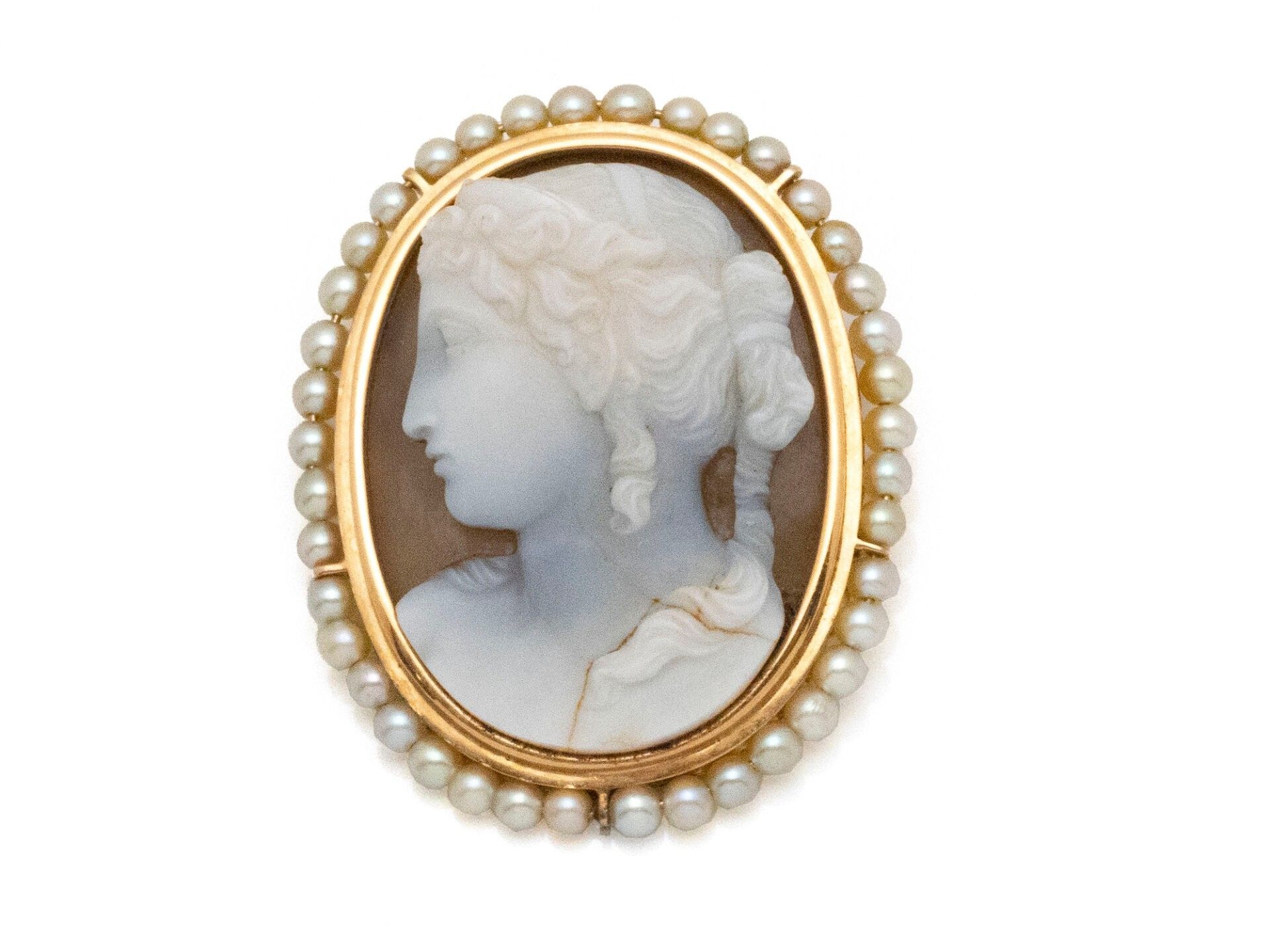 Pendant brooch in 750 thousandths gold, set with a 2-layer agate cameo carved with the left profile of a woman wearing a tiara, surrounded by small pearls, probably fine.