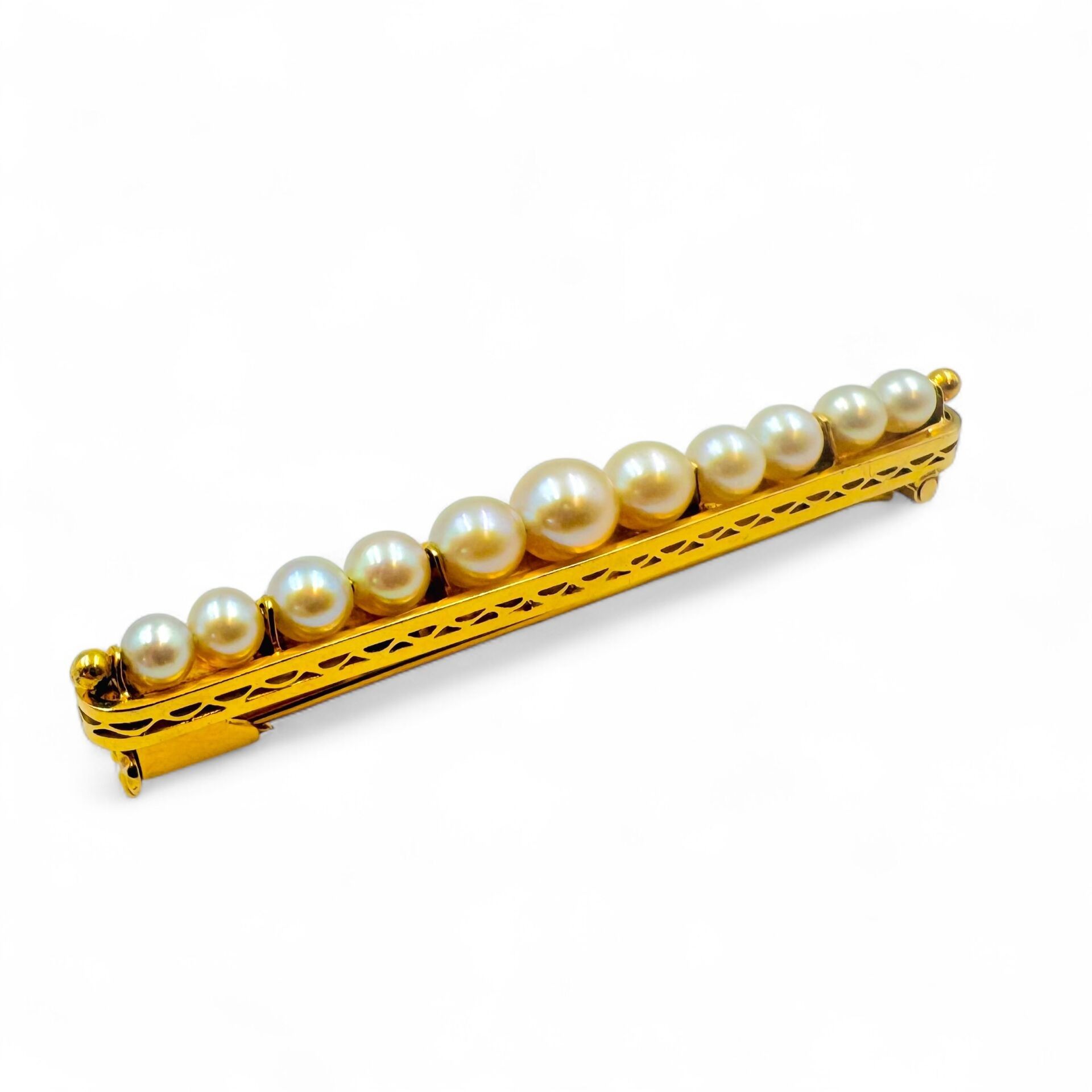Barrette brooch in yellow gold (750) decorated with falling cultured pearls.