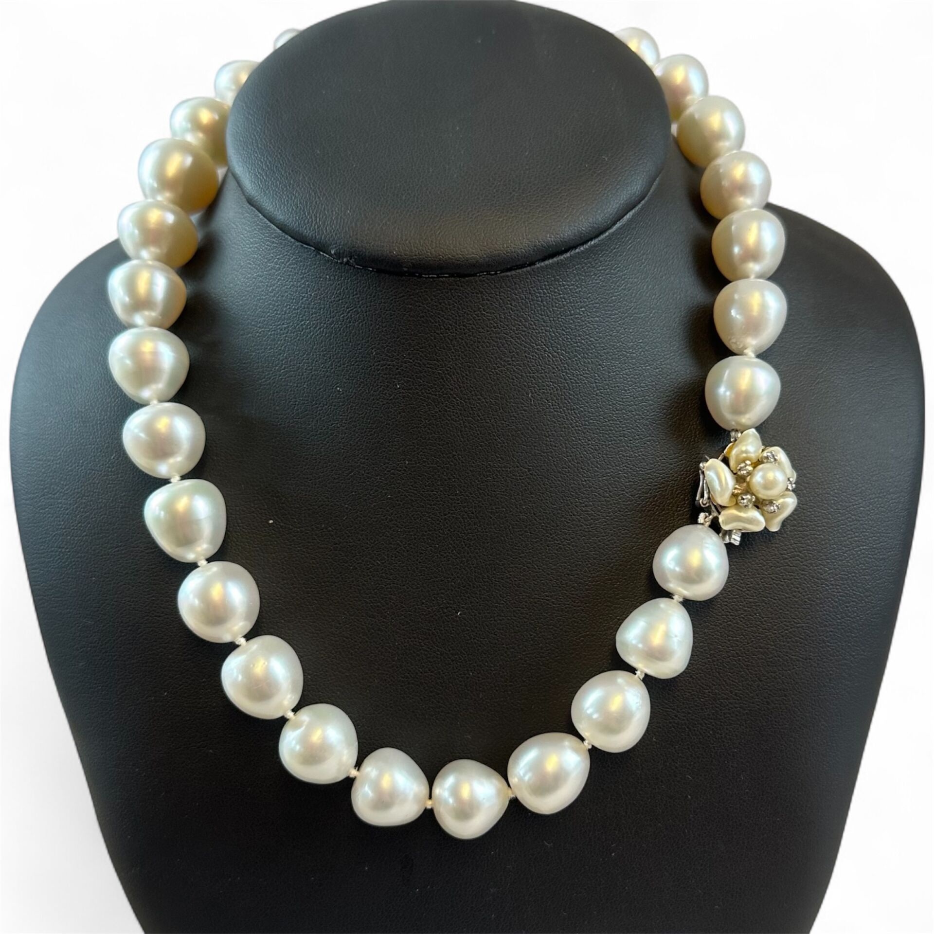 Necklace of 29 slightly baroque white cultured pearls, the white gold (585) ratchet clasp decorated with a flower made of baroque half-pearls and centred on a cultured pearl surrounded by small eight-eighth-cut diamonds.
