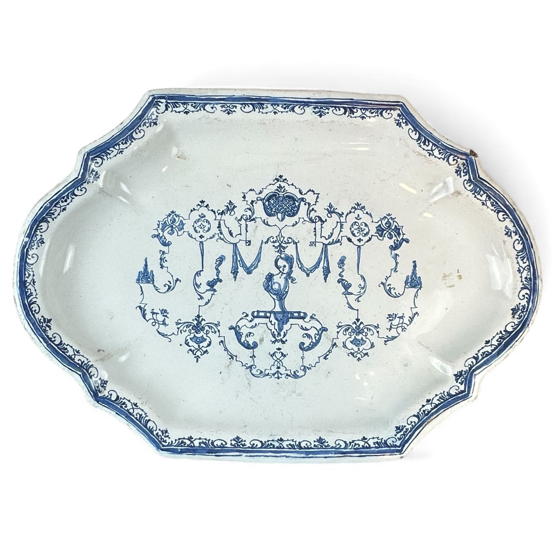 Oval dish with contoured edge, decorated in blue monochrome with mmbrequins and grotesques à la Bérain.
