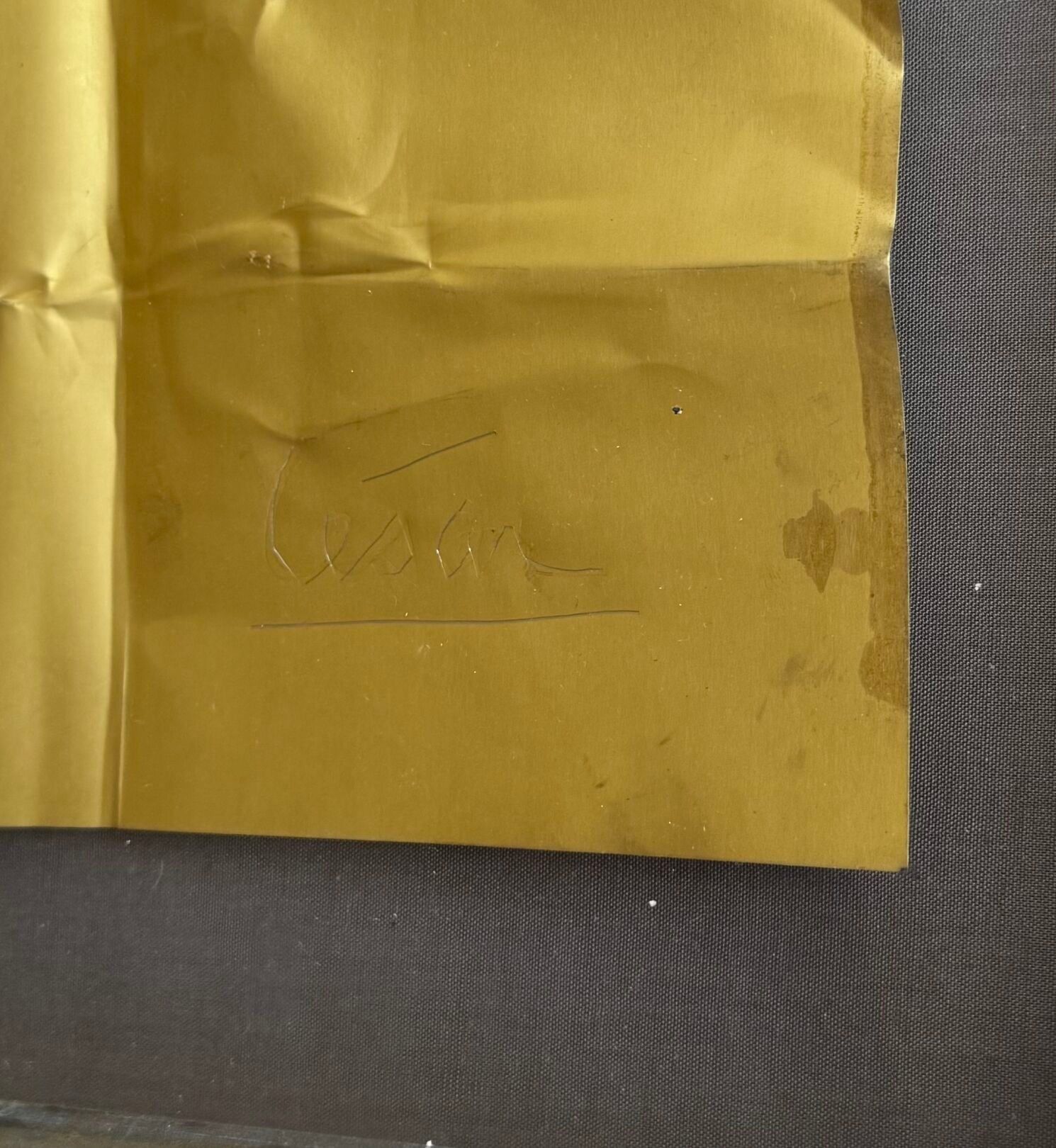 César, who was visiting Le Provençal to greet his friend Jean-René Laplayne, was impressed by the switch from lead to letterflex, a material to which he attributed aesthetic qualities. So much so that he decided to make a compression of it as a gift for his friend, which remained in his office until the end of his career.