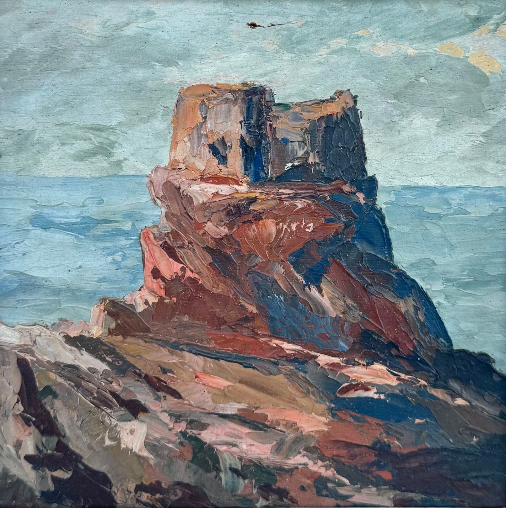 View of a tower by the sea (possibly a Genoese tower in Corsica).