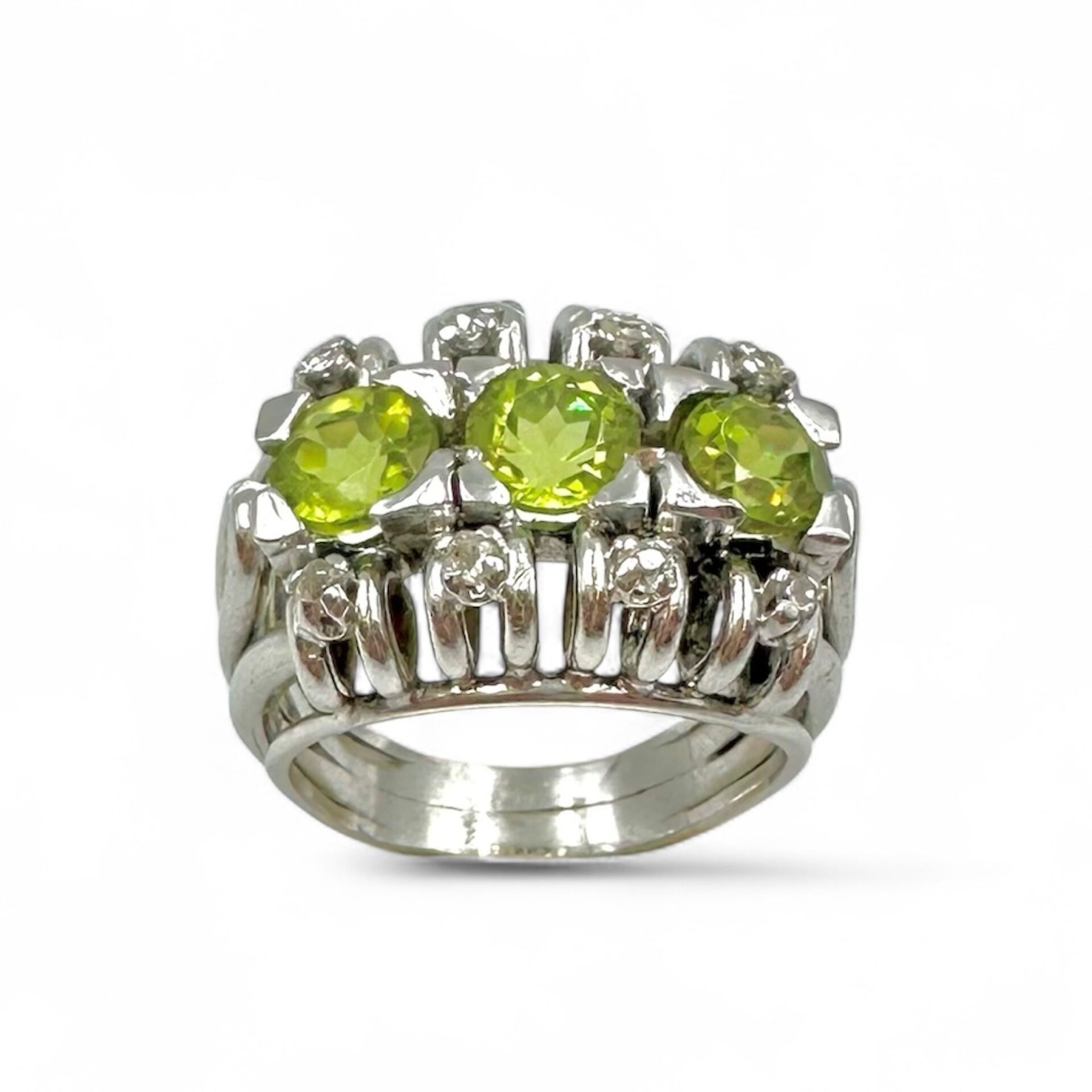 Platinum (850) ring set with three circular-cut peridots set with diamonds.