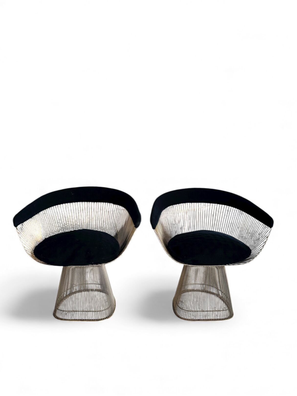 Pair of armchairs from the "Platner" collection with truncated cone-shaped frame in nickel-plated steel mesh, seat and back in original midnight blue fabric.