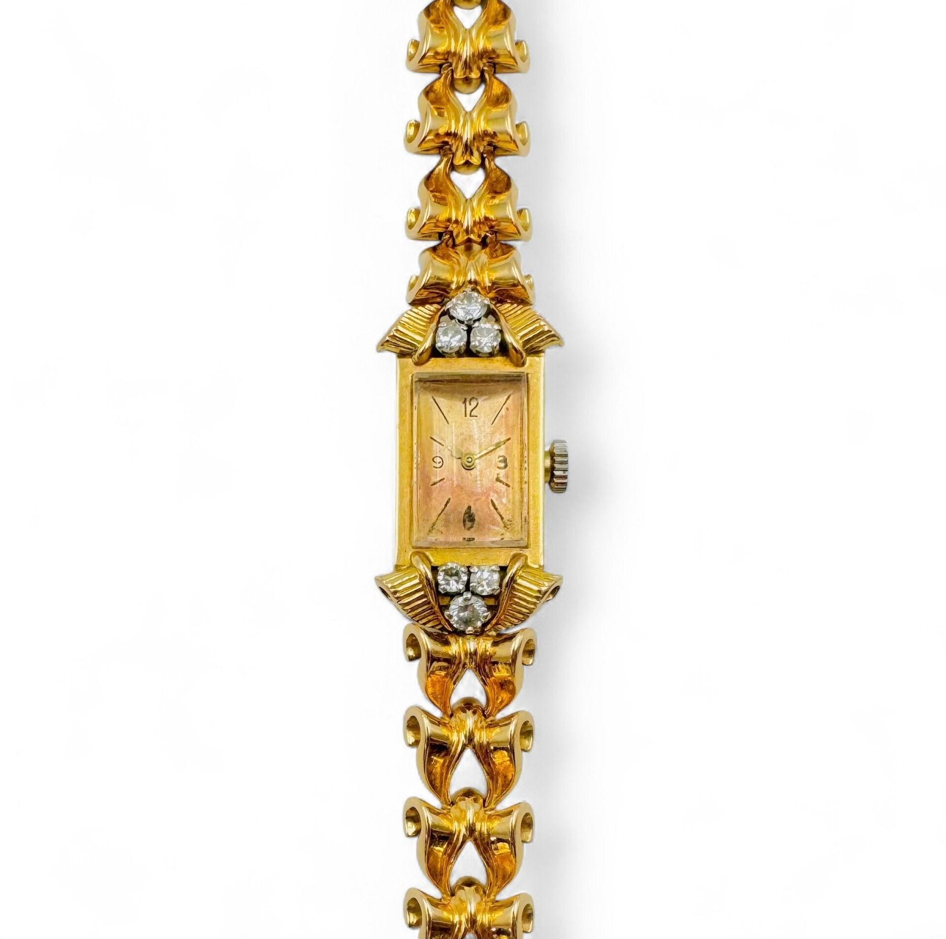 Rectangular case, adorned with small brilliant-cut diamonds, champagne dial.