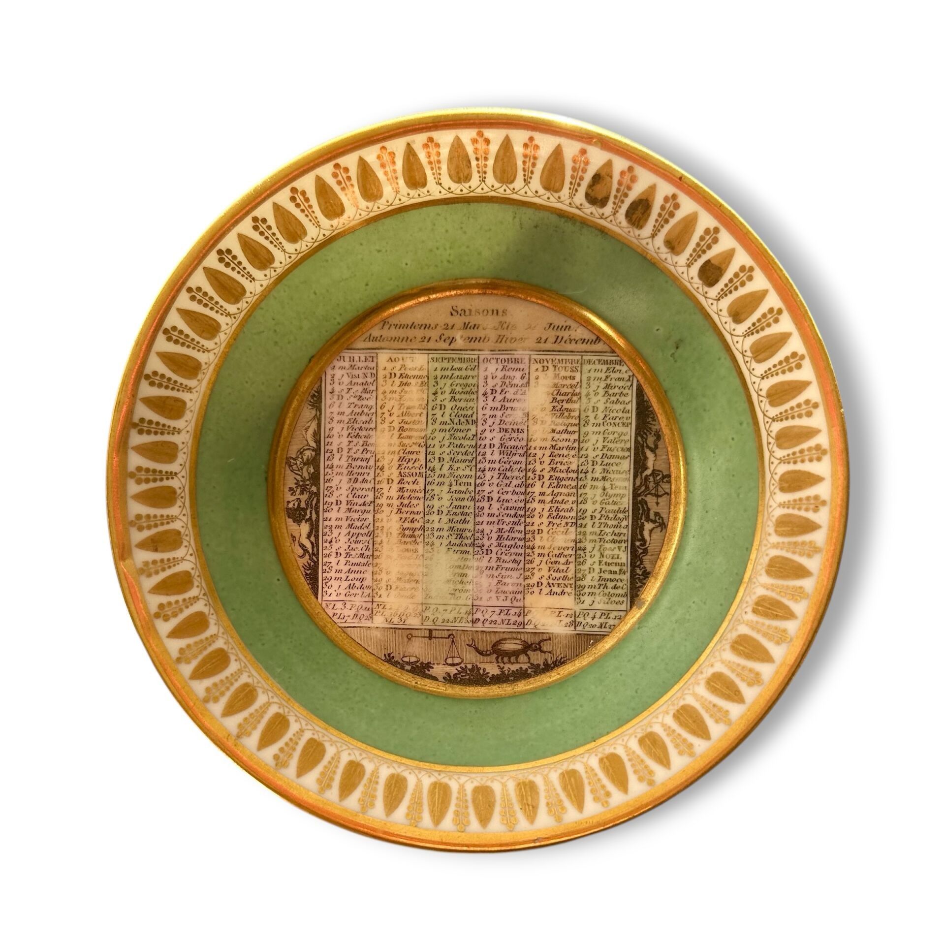 Porcelain saucer with polychrome and gold decoration of a calendar from 1st July to 31st December.