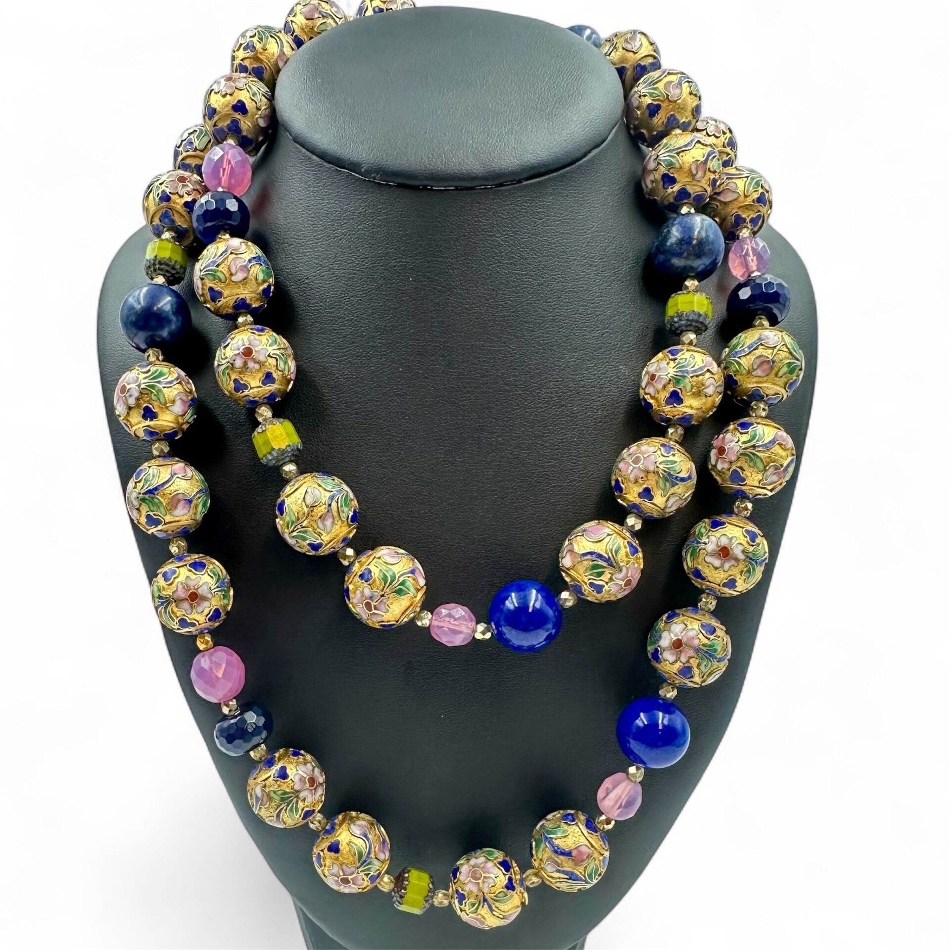 Long necklace made up of lapis lazuli balls and gilded metal balls with floral decoration in cloisonné enamel.