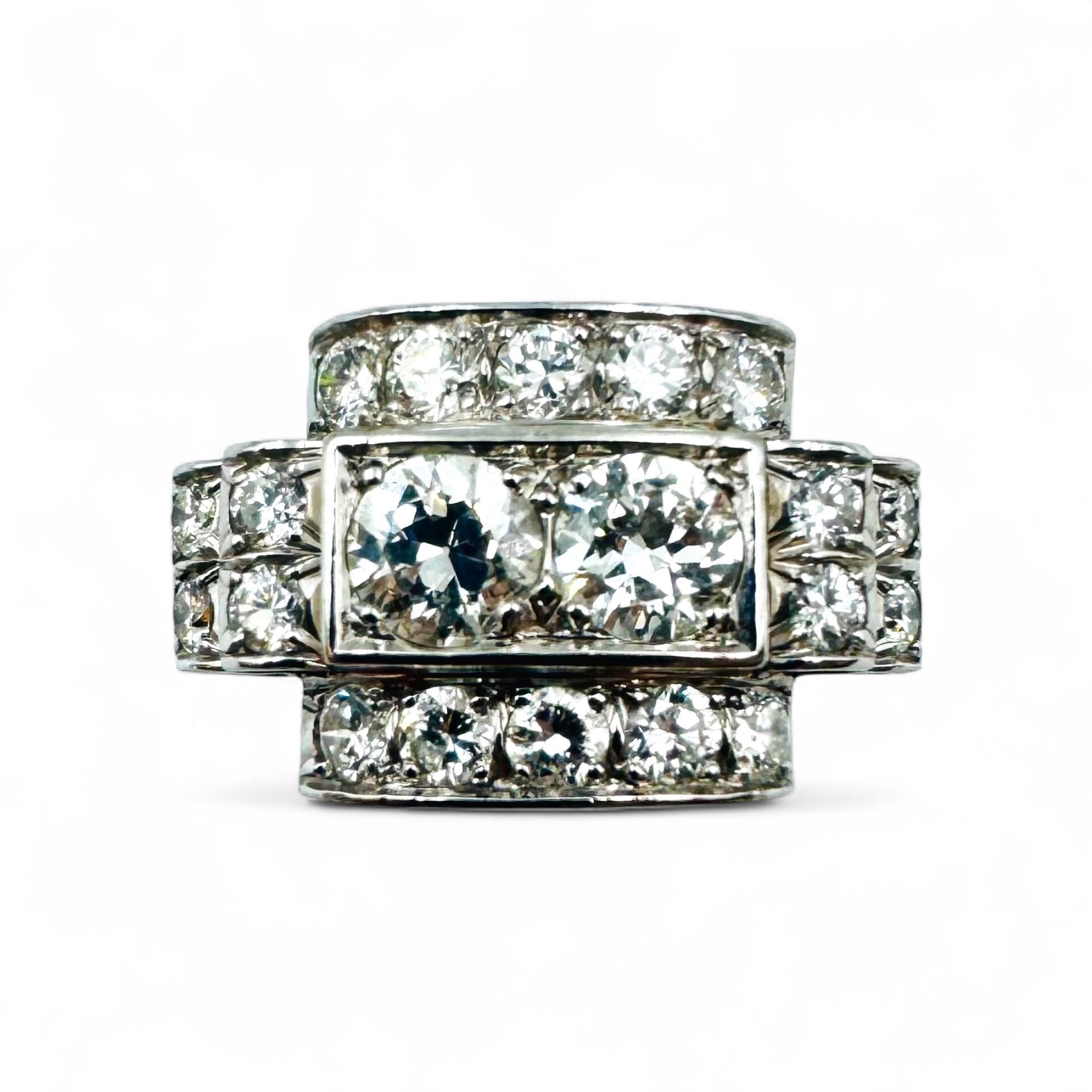 Platinum (850) tank ring entirely set with brilliant-cut diamonds, including two larger central diamonds.
