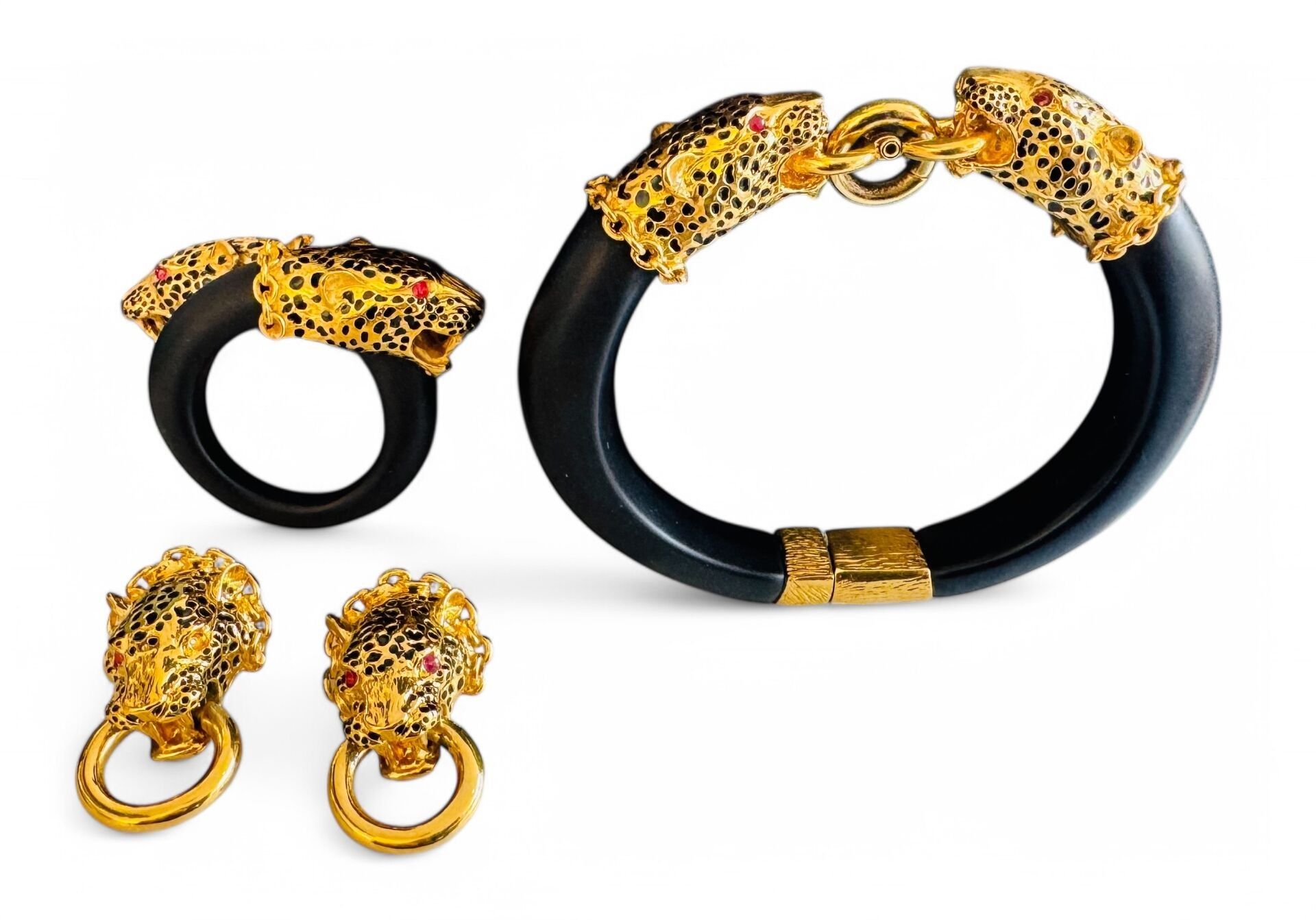 Panther ensemble in gilt metal and black enamel, the eyes set with small rubies, comprising an openwork bangle bracelet, a brooch and two earrings.