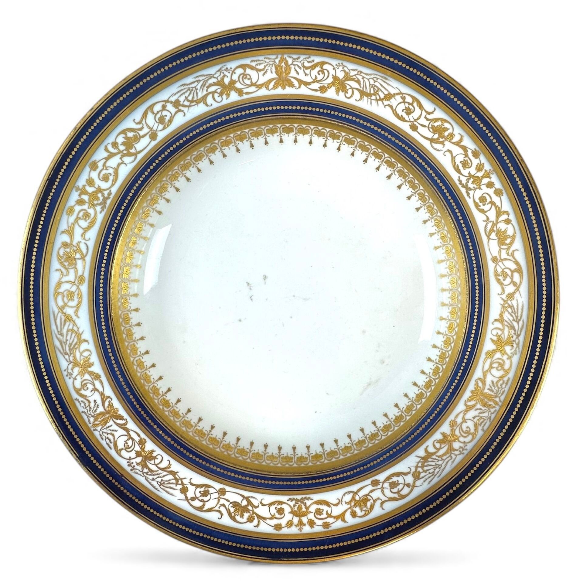 Porcelain soup plate decorated with gold scrolls and blue fillets with gold beading.