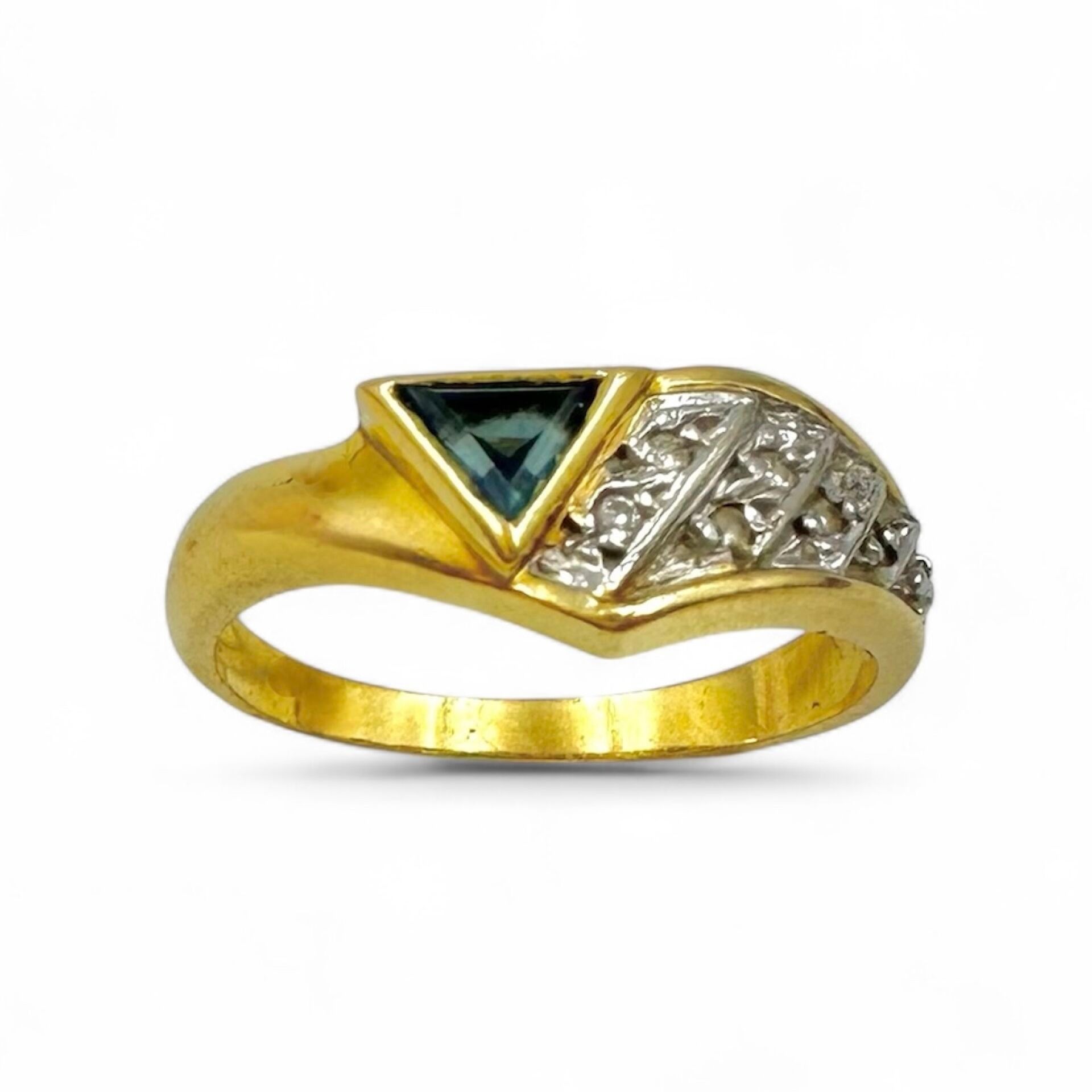 Yellow gold (750) ring set with a triangular sapphire and small diamonds.