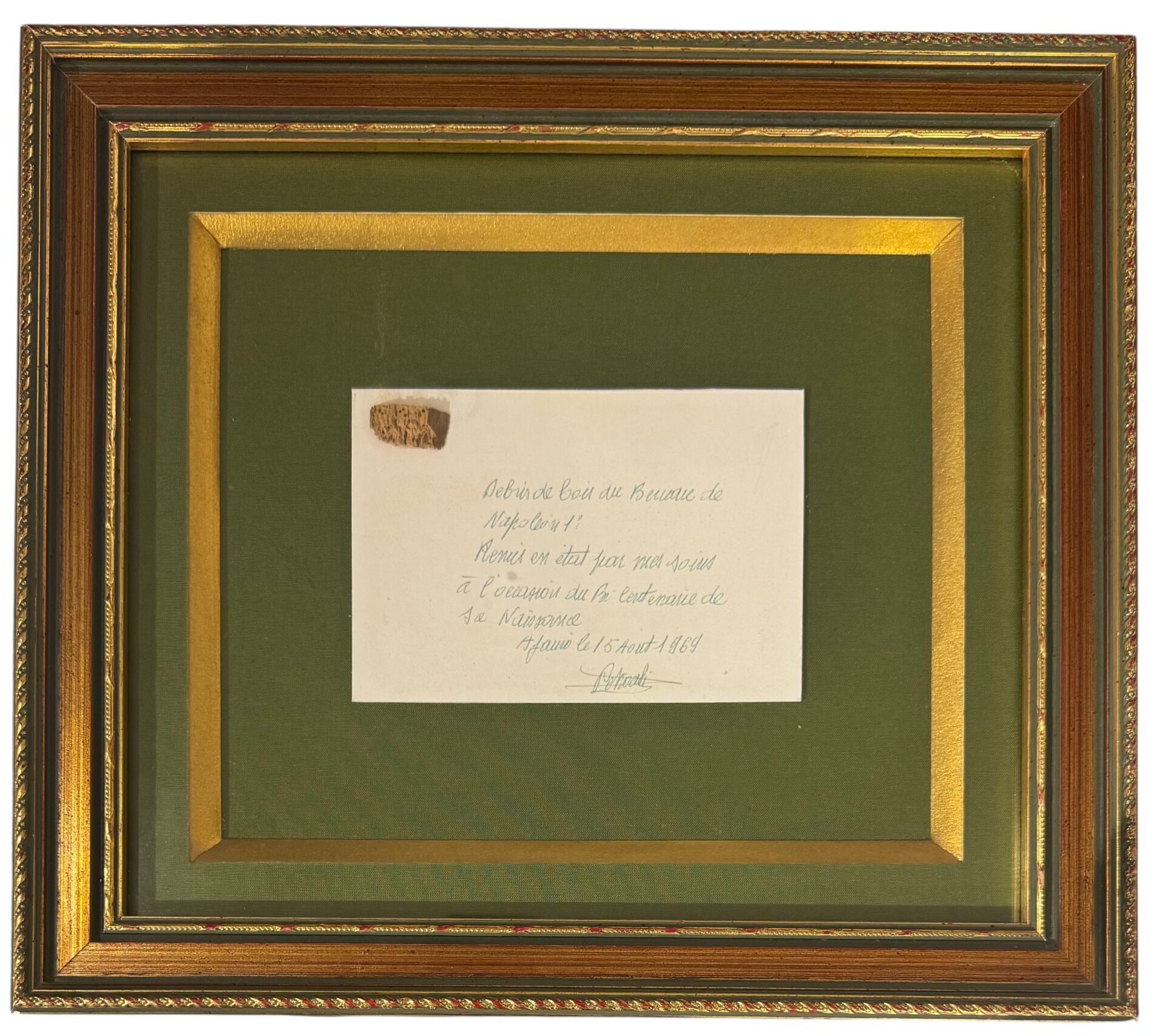 Rectangular piece of wood mounted on a card bearing the handwritten words "Remains of Napoleon I's cradle. Restored by myself on the occasion of the bicentenary of his birth. In Ajaccio on 15 August 1969", signed "Petrocchi". Also stamped on the back "Michel Petrocchi, officier-radio, 12 cours Napoléon, 12, Ajaccio".