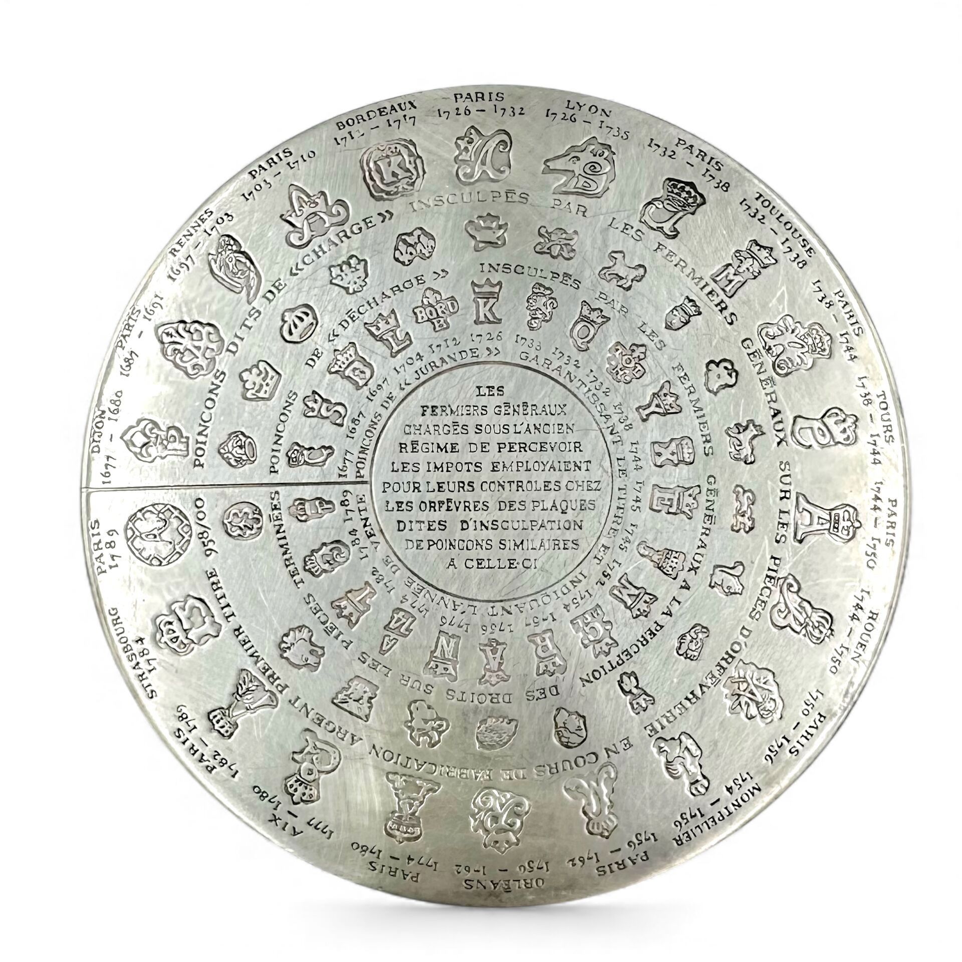 Silver-plated bottle coaster, inculpations model, decorated with the silver hallmarks of the Fermiers Généraux of the 18th century, felt lining.