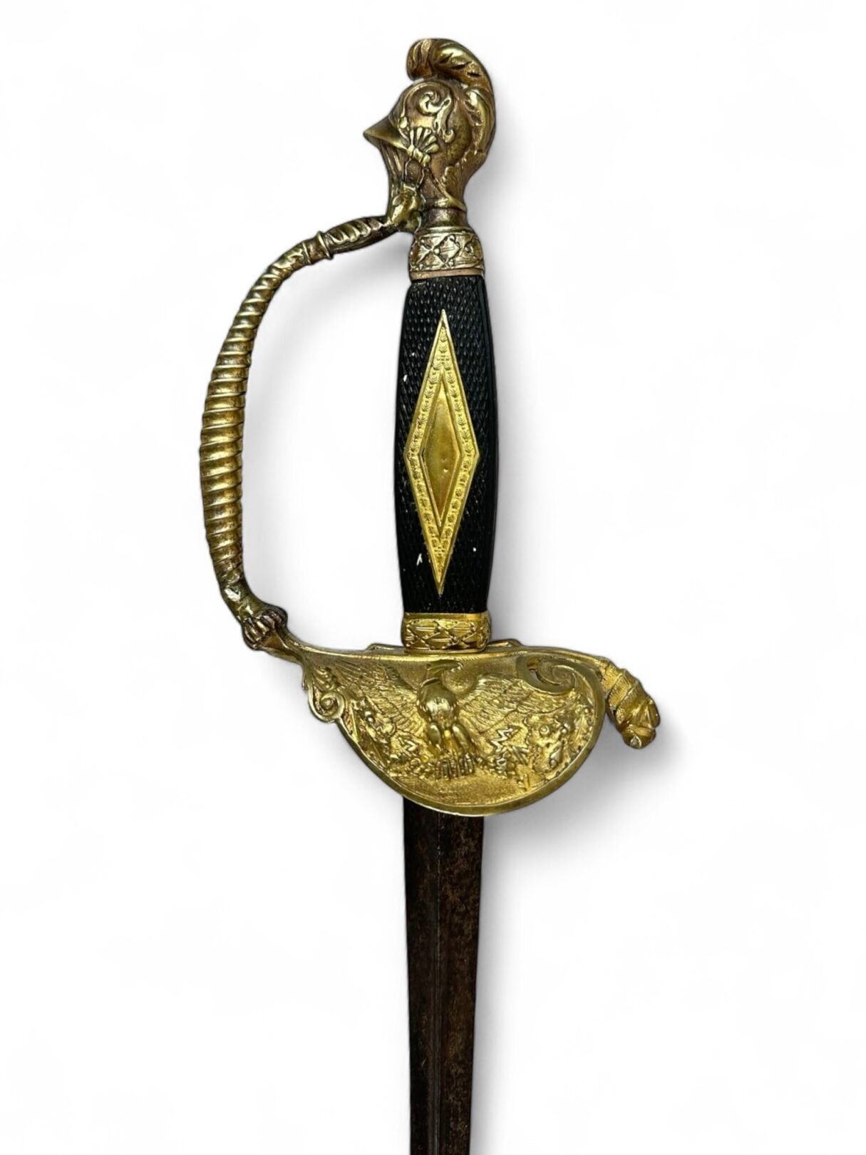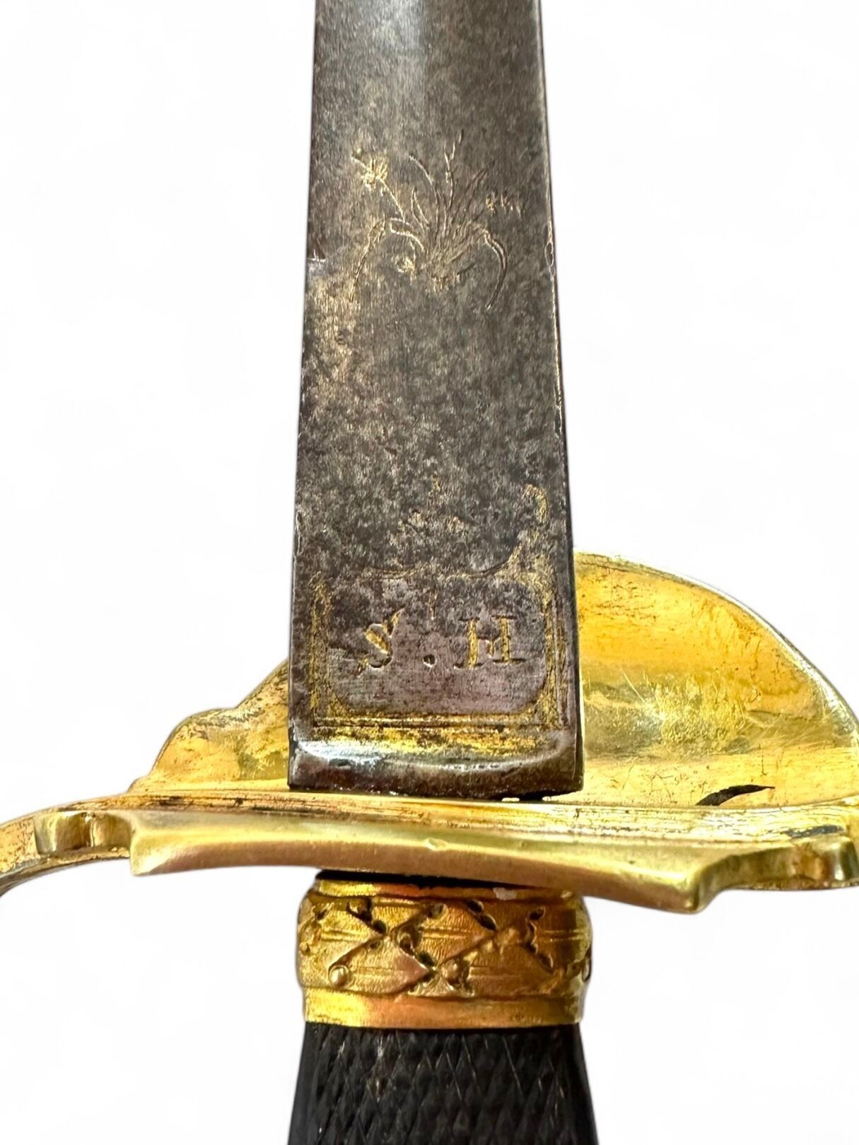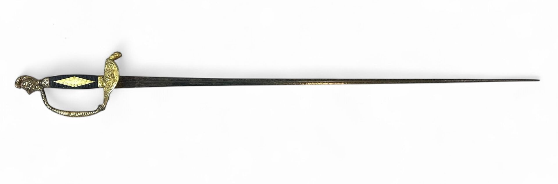 Officer's sword. Gilt brass handle and guard, squared wooden spindle inlaid with a gilt brass lozenge. Helmeted pommel, twisted guard with traces of repair. Guard shell decorated with a filed eagle. Straight blade with triangular section, engraved ornamentation on the first quarter of the blade and "SH" hallmark, oxidation and dents on the cutting edge. 19th century. Blade length: 80.6 cm. - Total length: 95.8 cm. As is, traces of oxidation, scabbard missing.