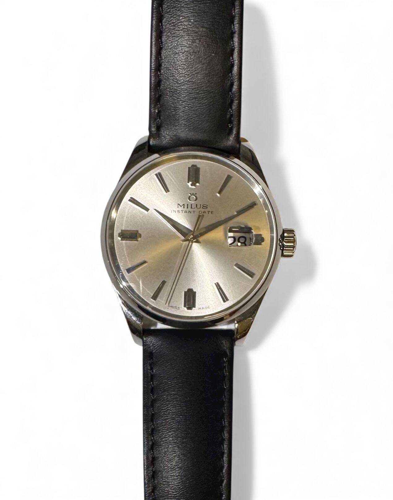Circular 40 mm case, silvered dial, signed, date window at 3 o'clock and silvered baton hour markers.