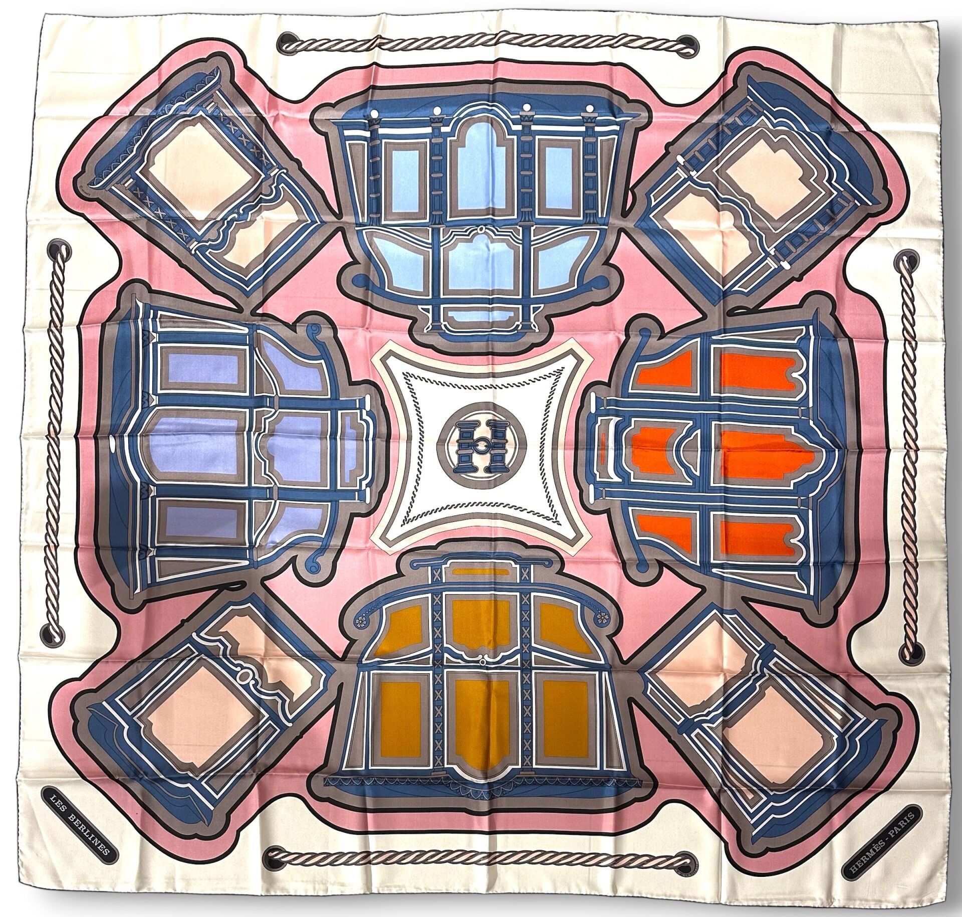 Giant square/shawl in printed silk twill titled "Les Berlines", white background, rolled in black.