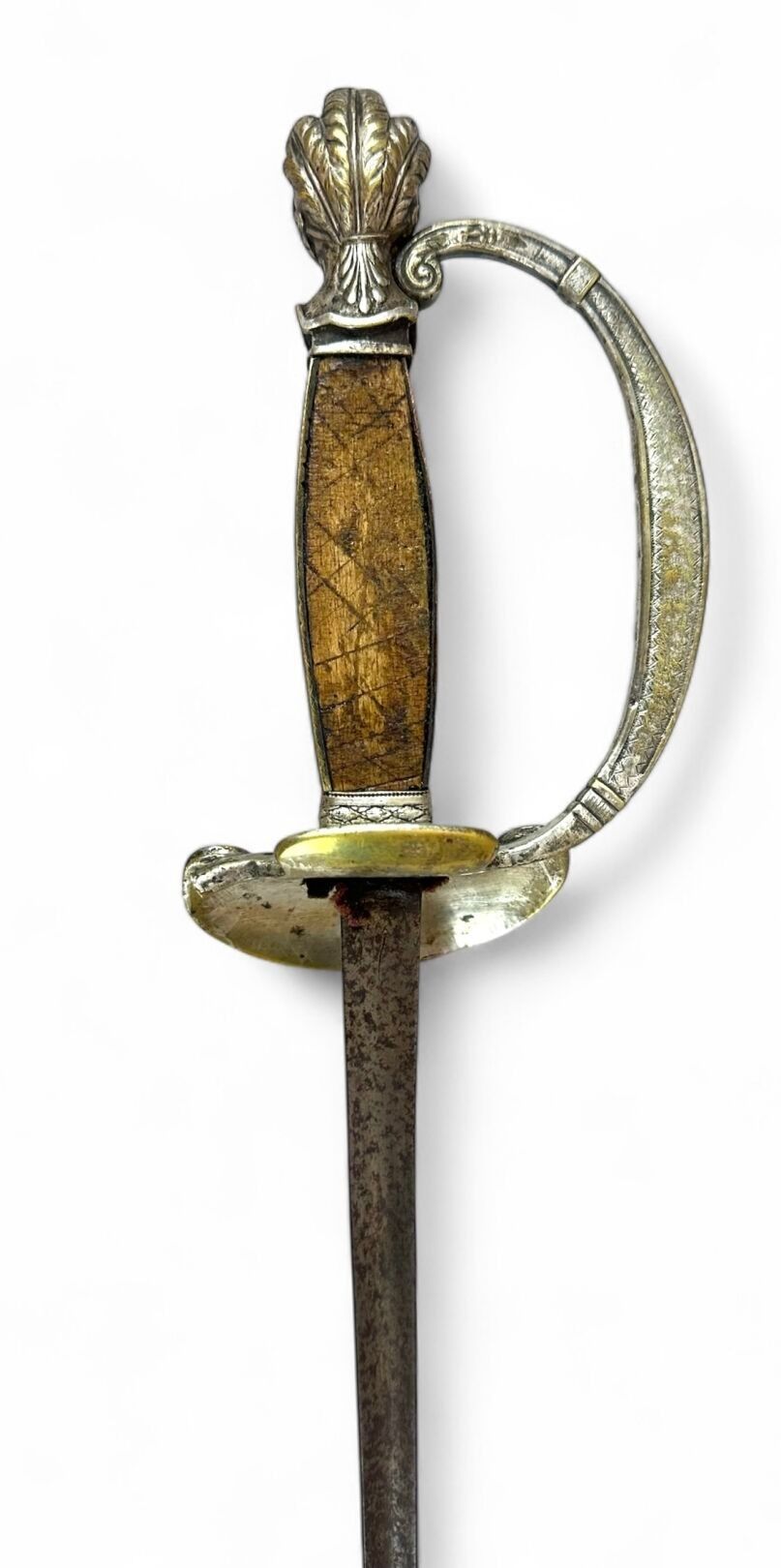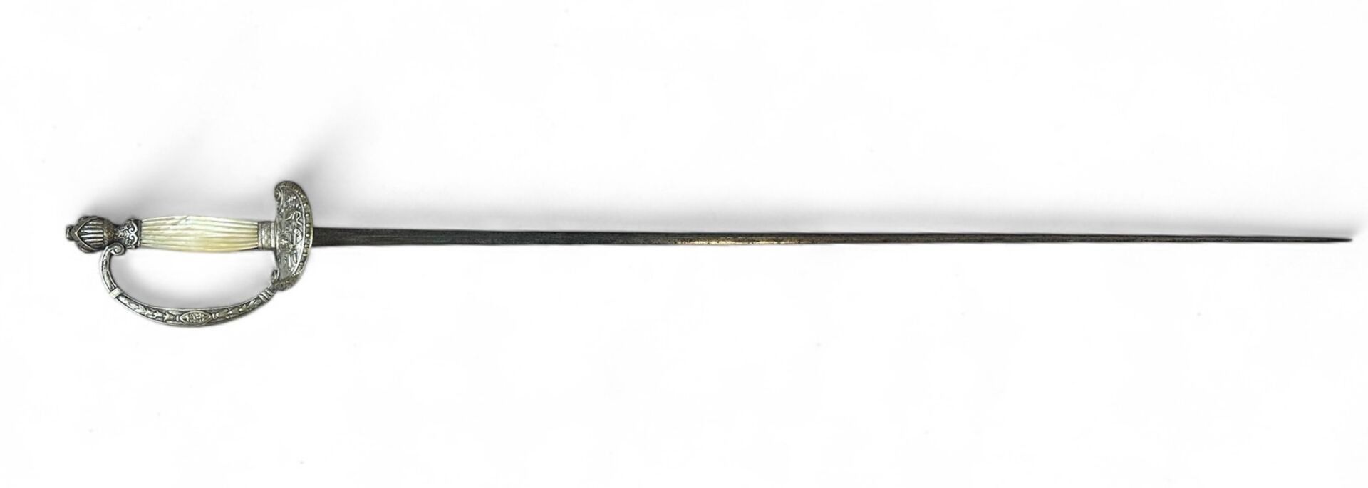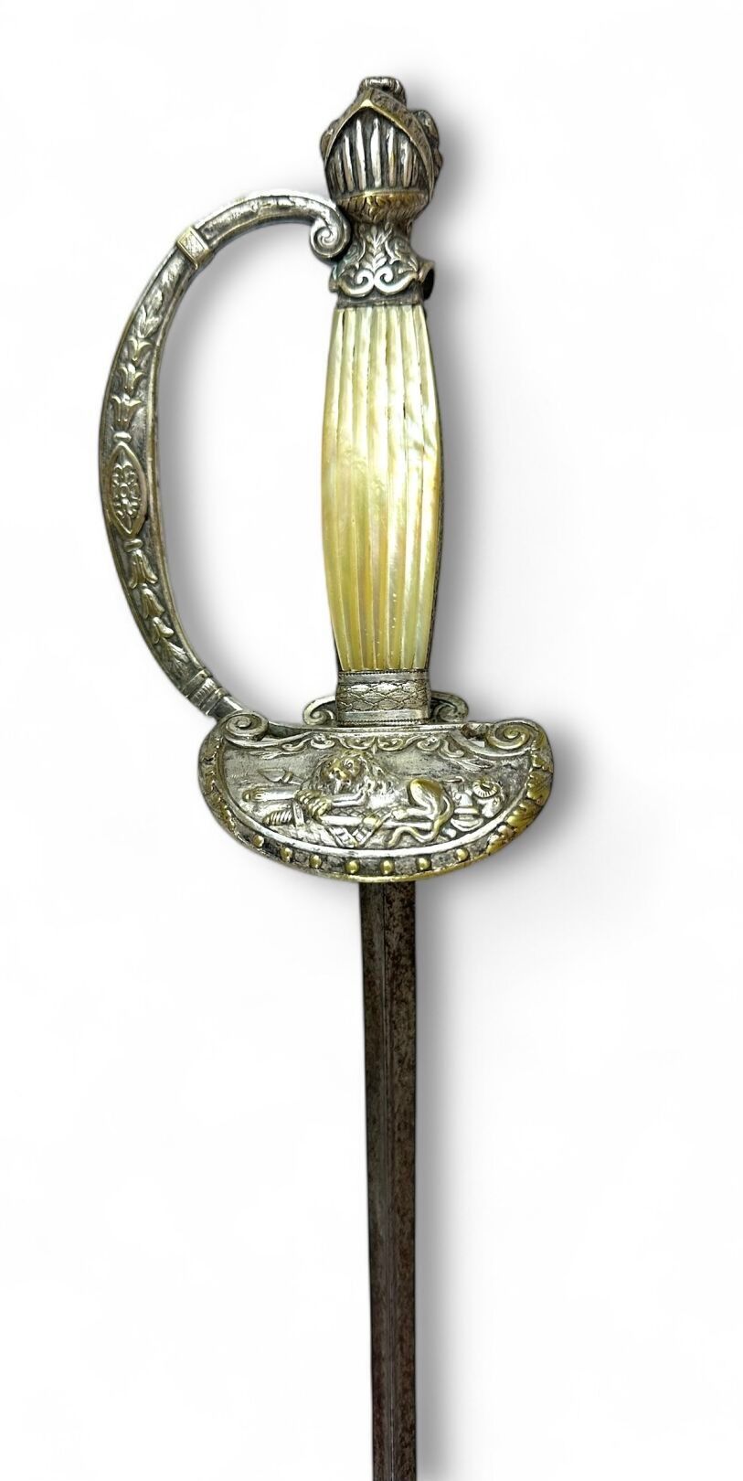 Officer's sword. Silver-plated brass handle and guard, mother-of-pearl plates, one missing. Pommel with helmeted head. Guard shell decorated with a lion and a bundle of arms. Straight blade with triangular section. Blade length: 77.3 cm. - Total length: 90.2 cm. 19th century. As is, traces of oxidation, scabbard missing.