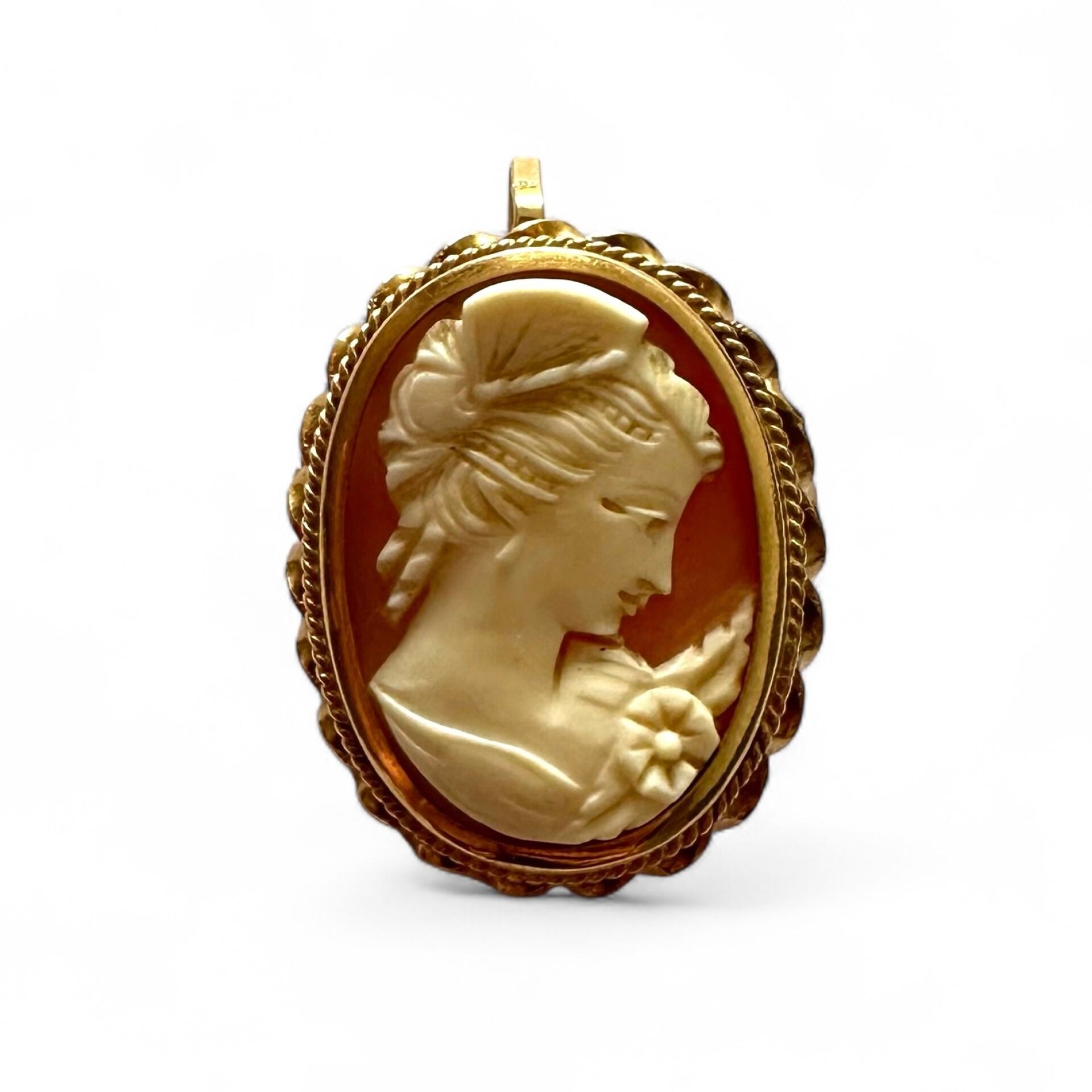 Oval brooch in yellow gold (750) holding a cameo on a shell depicting a woman's profile in the antique style.
