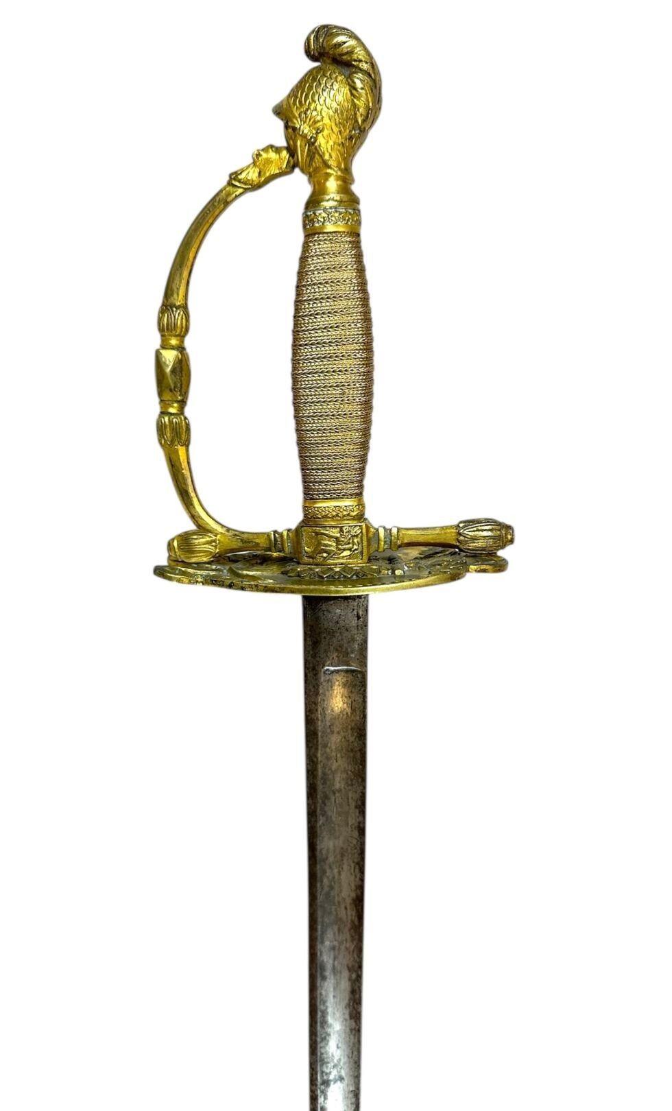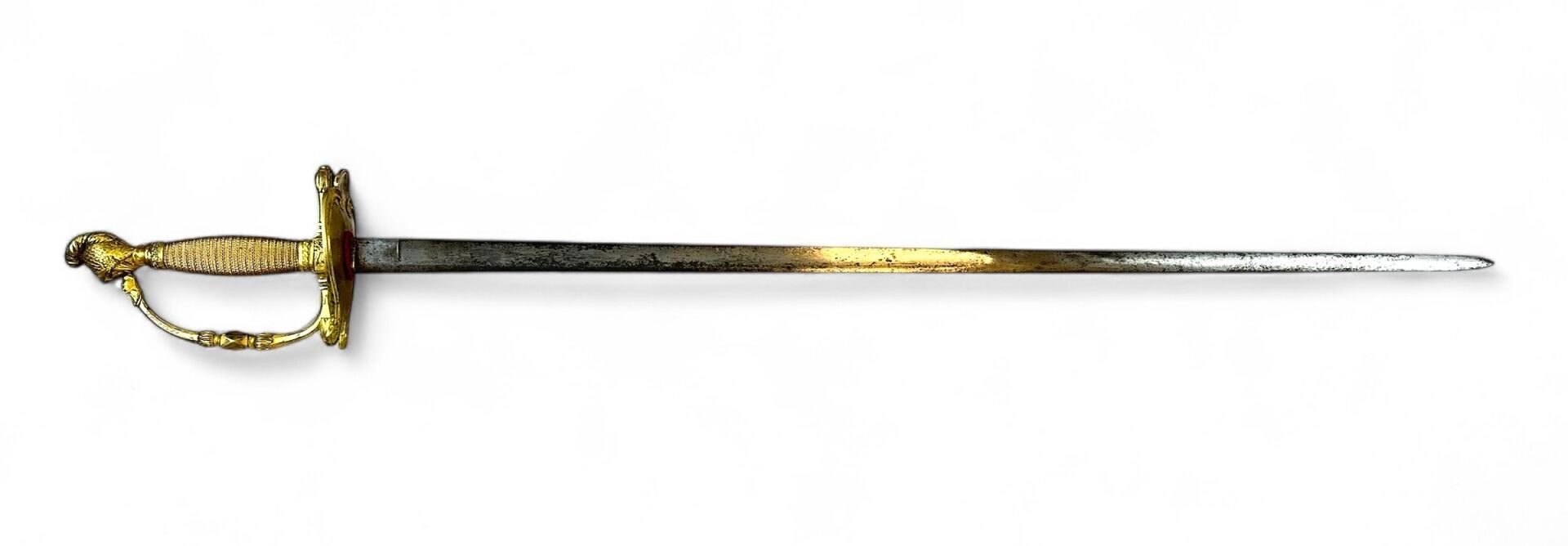 Officer's sword. Brass hilt and guard, brass filigree, remains of gilding. Helmeted pommel, guard decorated with a representation of the god Neptune armed with his trident. Single-edged straight blade, counter-edged on the last half. Remains of very faded chasing on the first quarter of the blade. Blade length: 77.2 cm - Total length: 94.1 cm 19th century. Fairly good condition, traces of oxidation, scabbard missing.