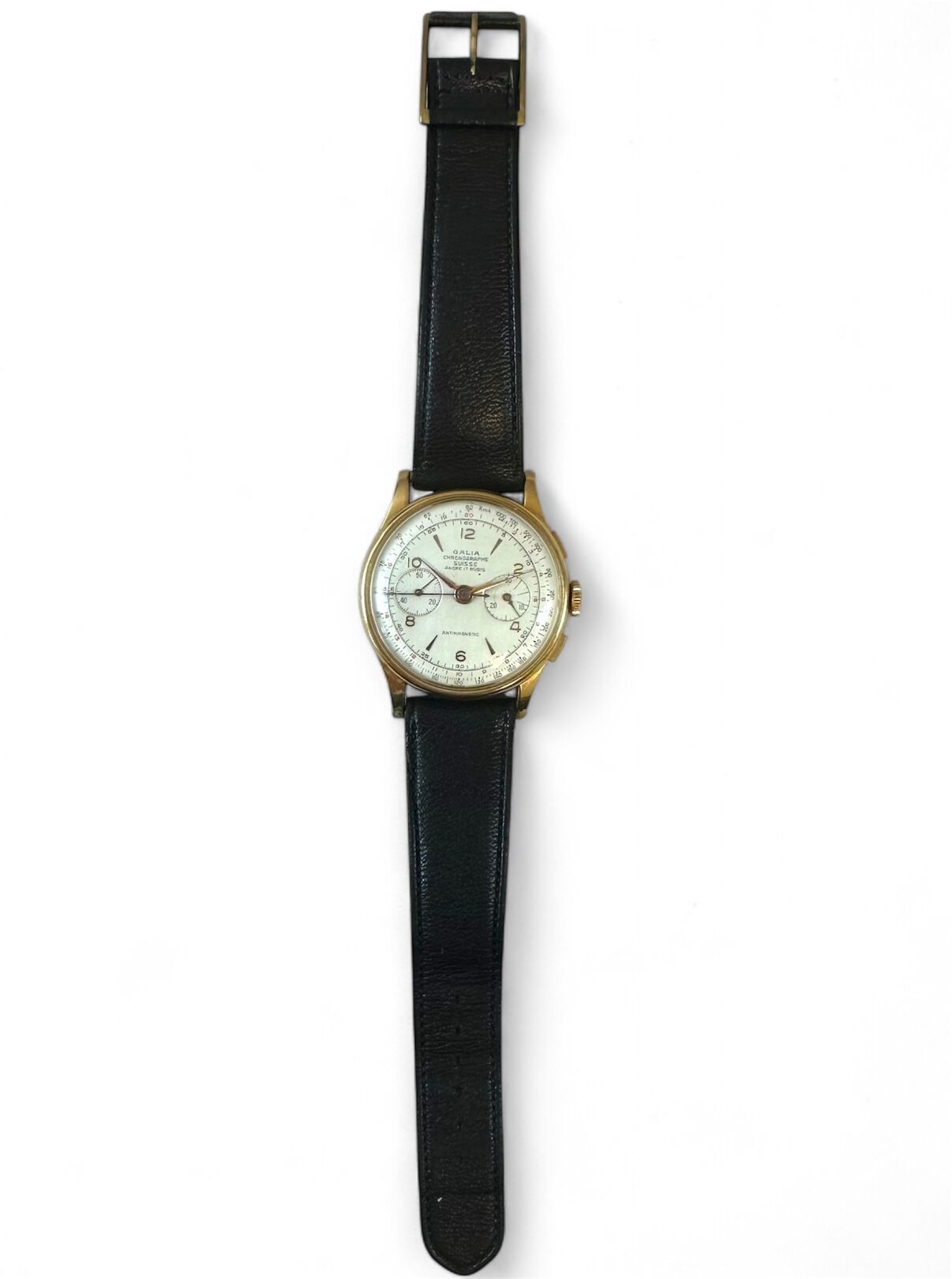 Circular case in yellow gold (750), two-counter dial, signed, with applied gold baton hour-markers.
