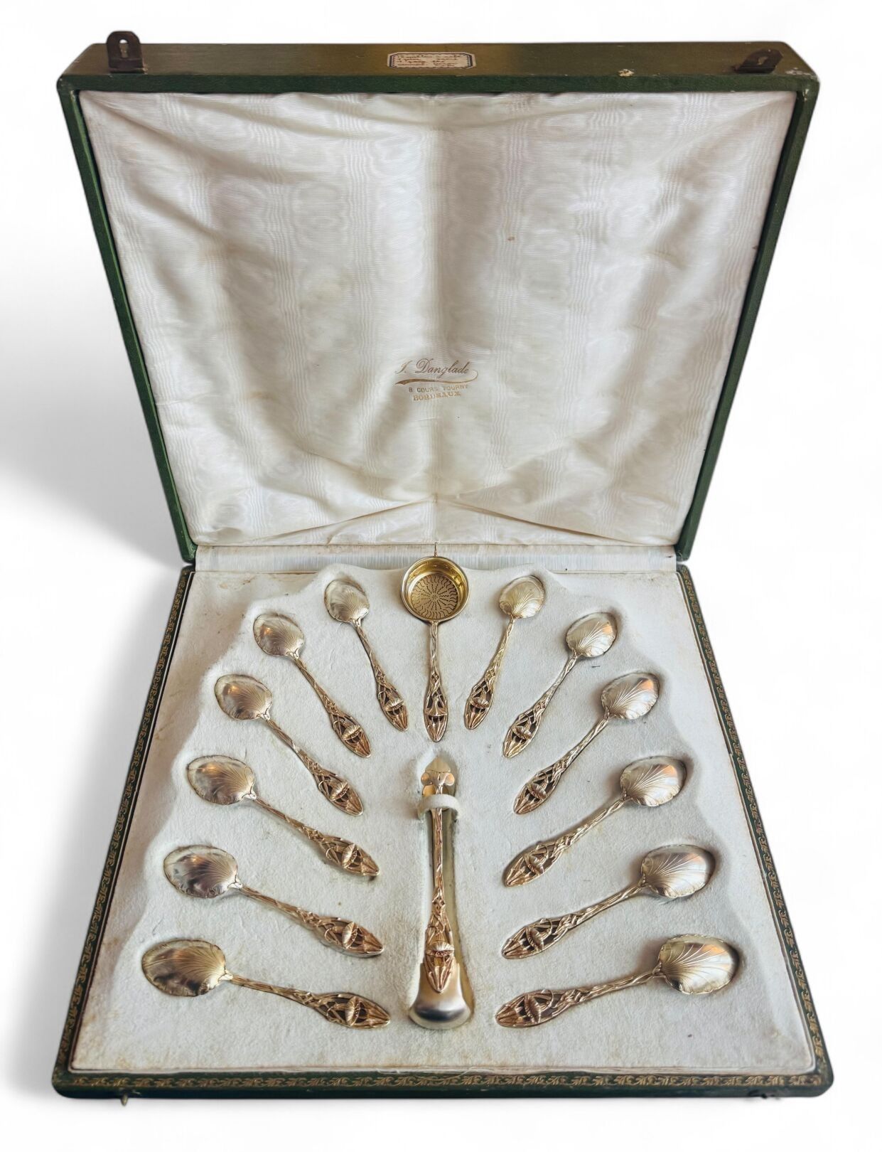 12 vermeil (950) coffee spoons, a tea strainer and sugar ton…