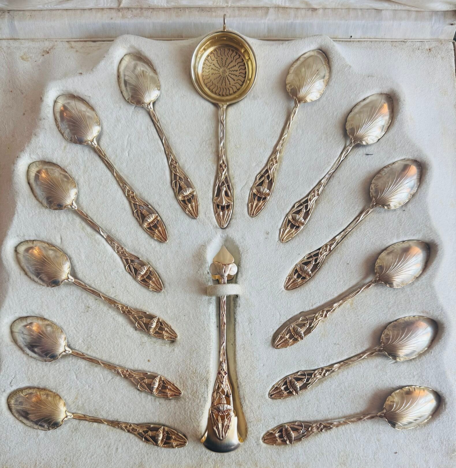 12 vermeil (950) coffee spoons, a tea strainer and sugar tongs with plant decoration.