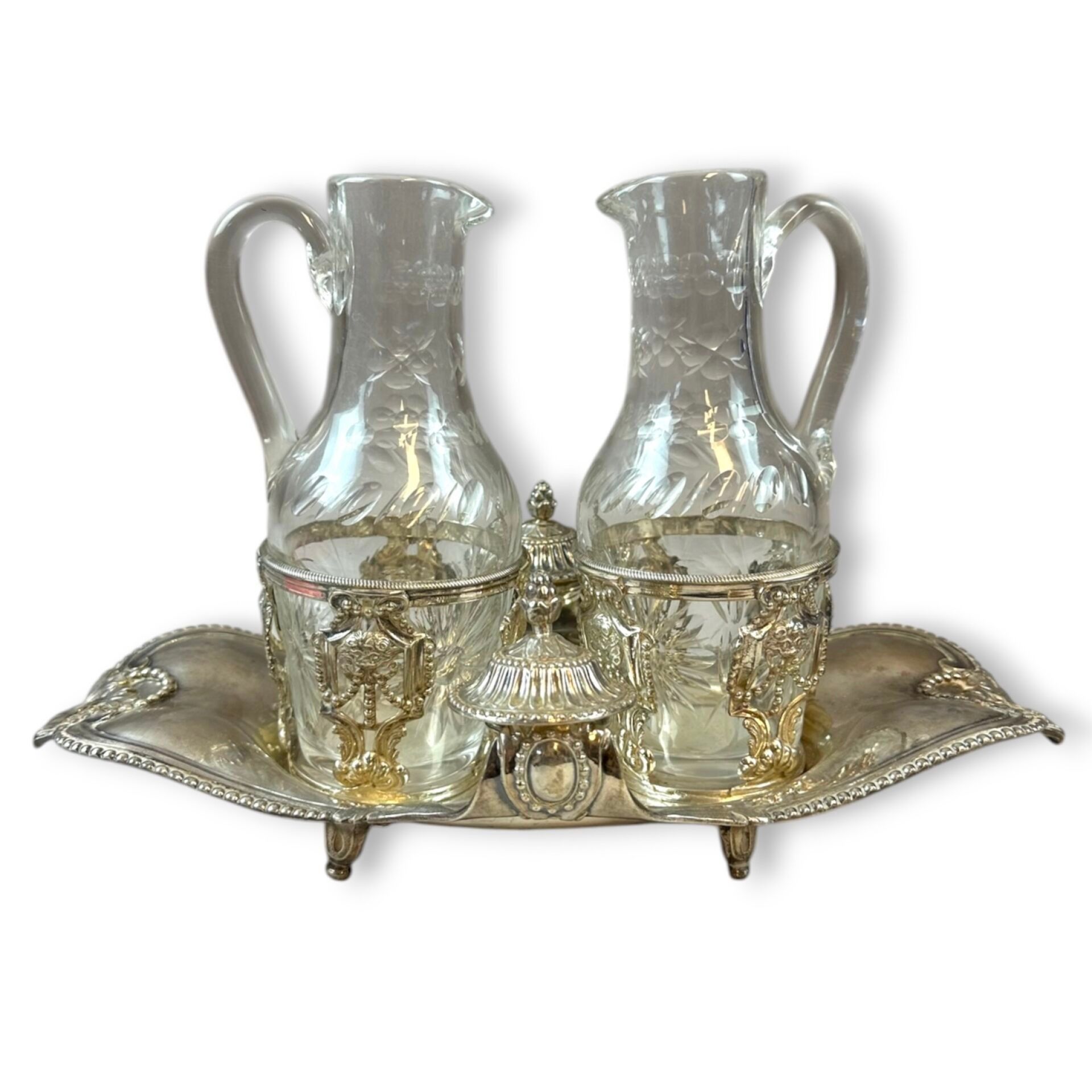 A four-legged contoured silver oil and vinegar cruet set, chased with garlands of flowers, rows of pearls and medallions.