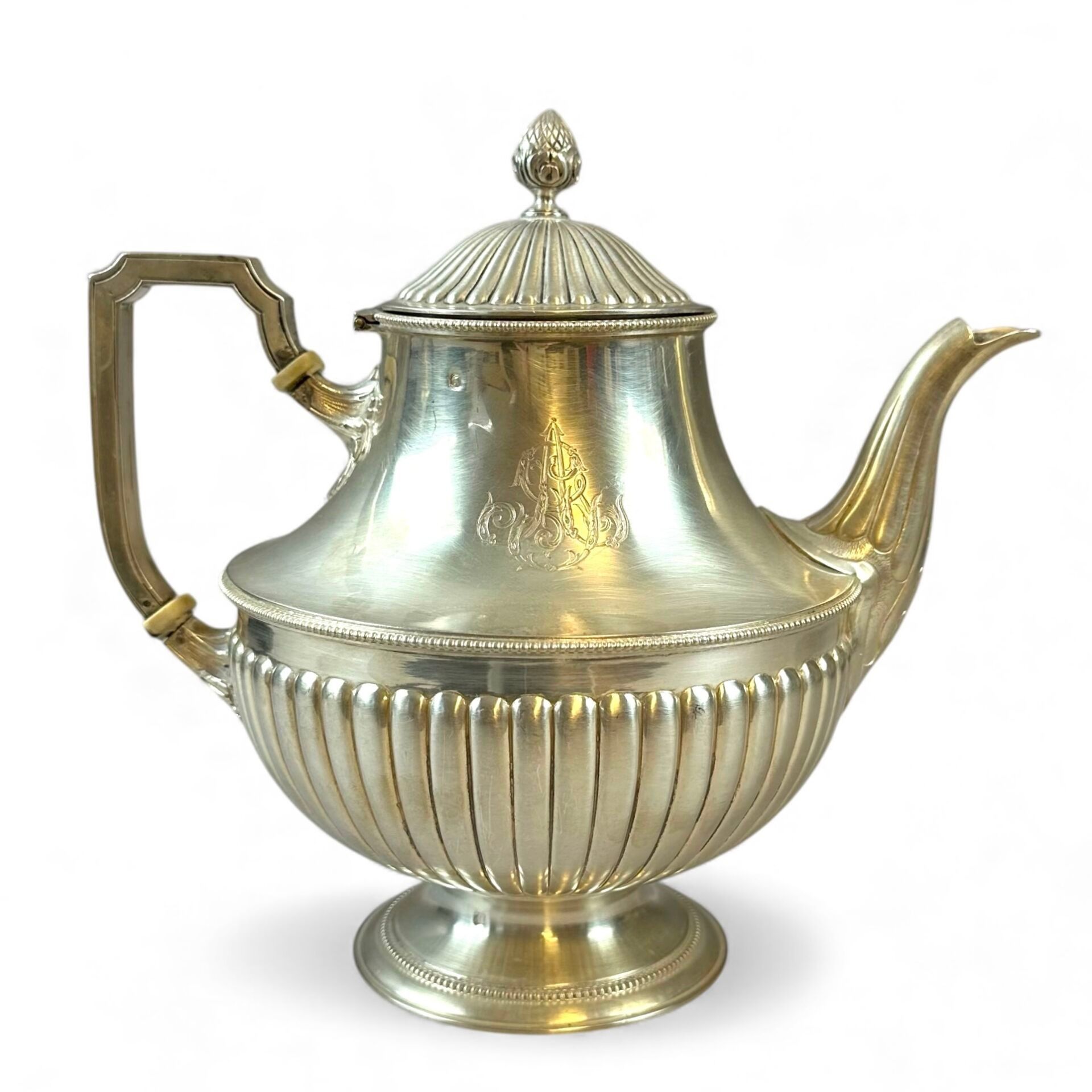 A baluster-shaped silver (950) coffee pot on a pedestal with gadrooned decoration, the hinged lid topped by a pinecone-shaped socket, the body engraved.