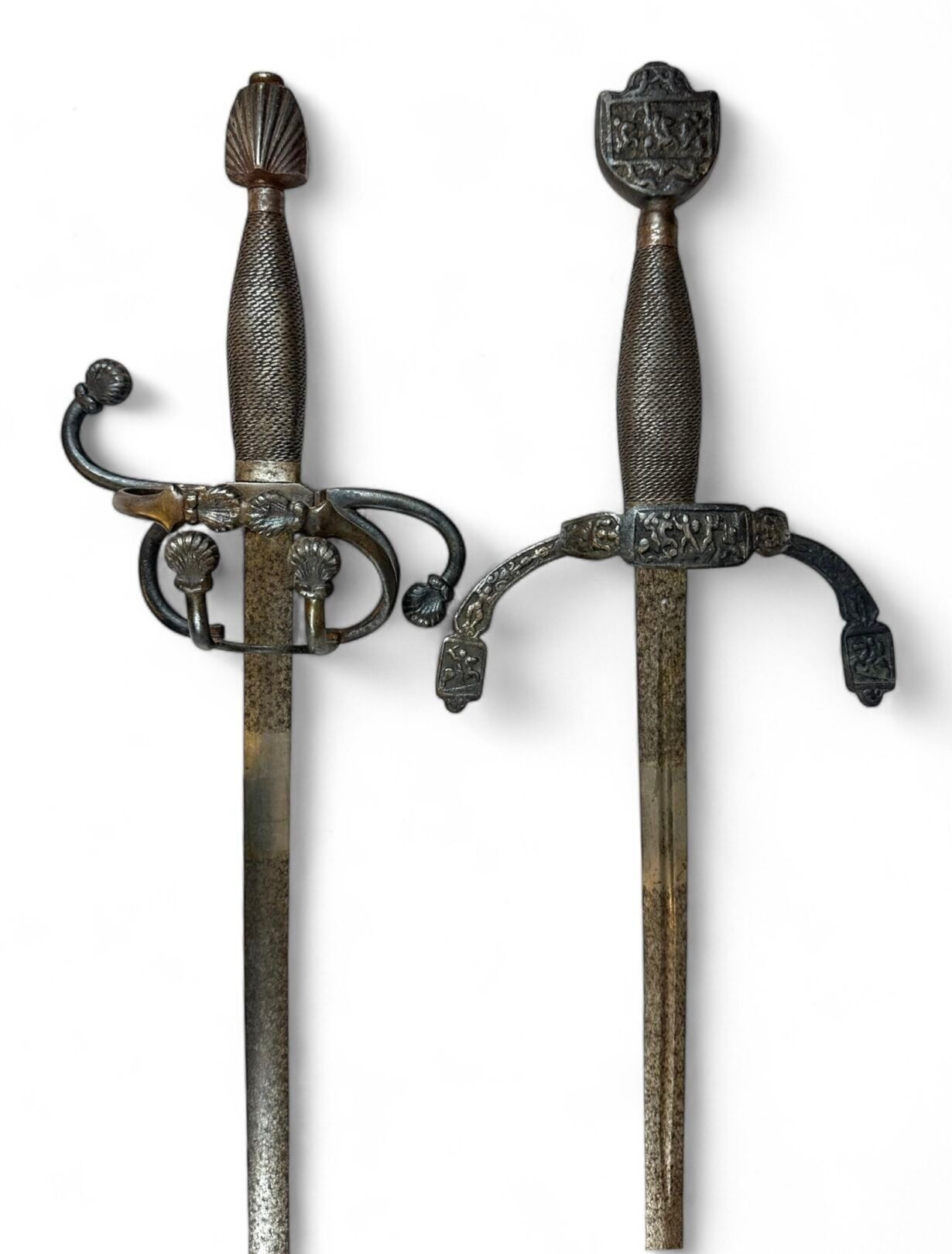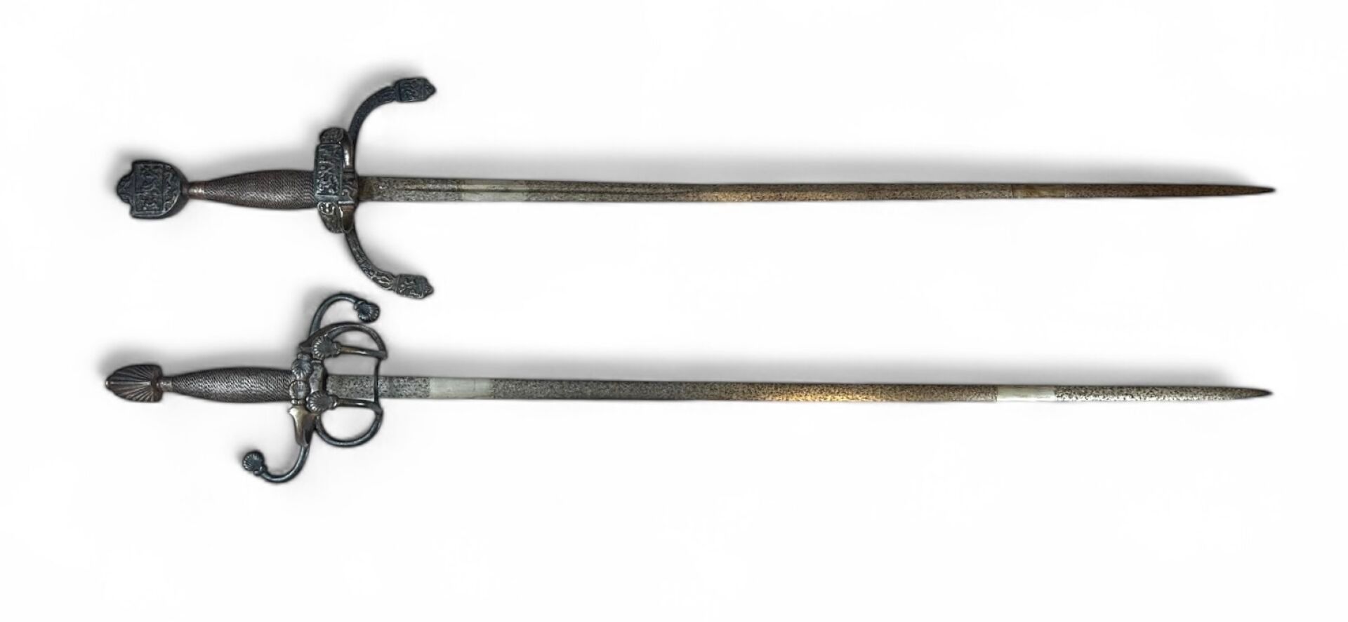 Pair of decorative swords, modern reproduction. Steel handles and guards, traces of oxidation. Straight blades, oxidised. Without scabbard. 20th century. Blade lengths: 85.5 and 88 cm. - Total length: 107.5 and 107 cm. Poor condition, traces of oxidation.