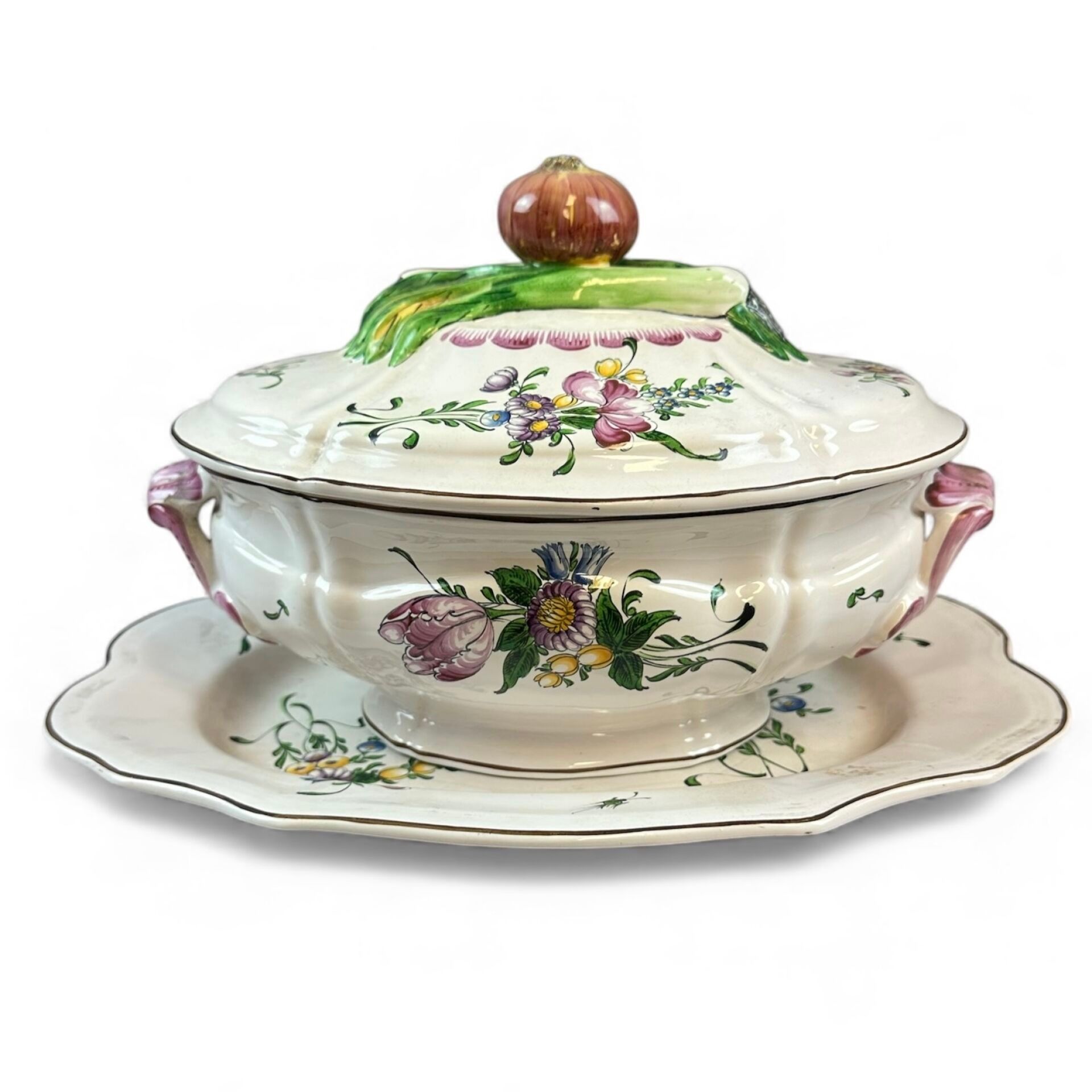Covered earthenware tureen and stand with polychrome decoration of bunches of flowers. Onion-shaped