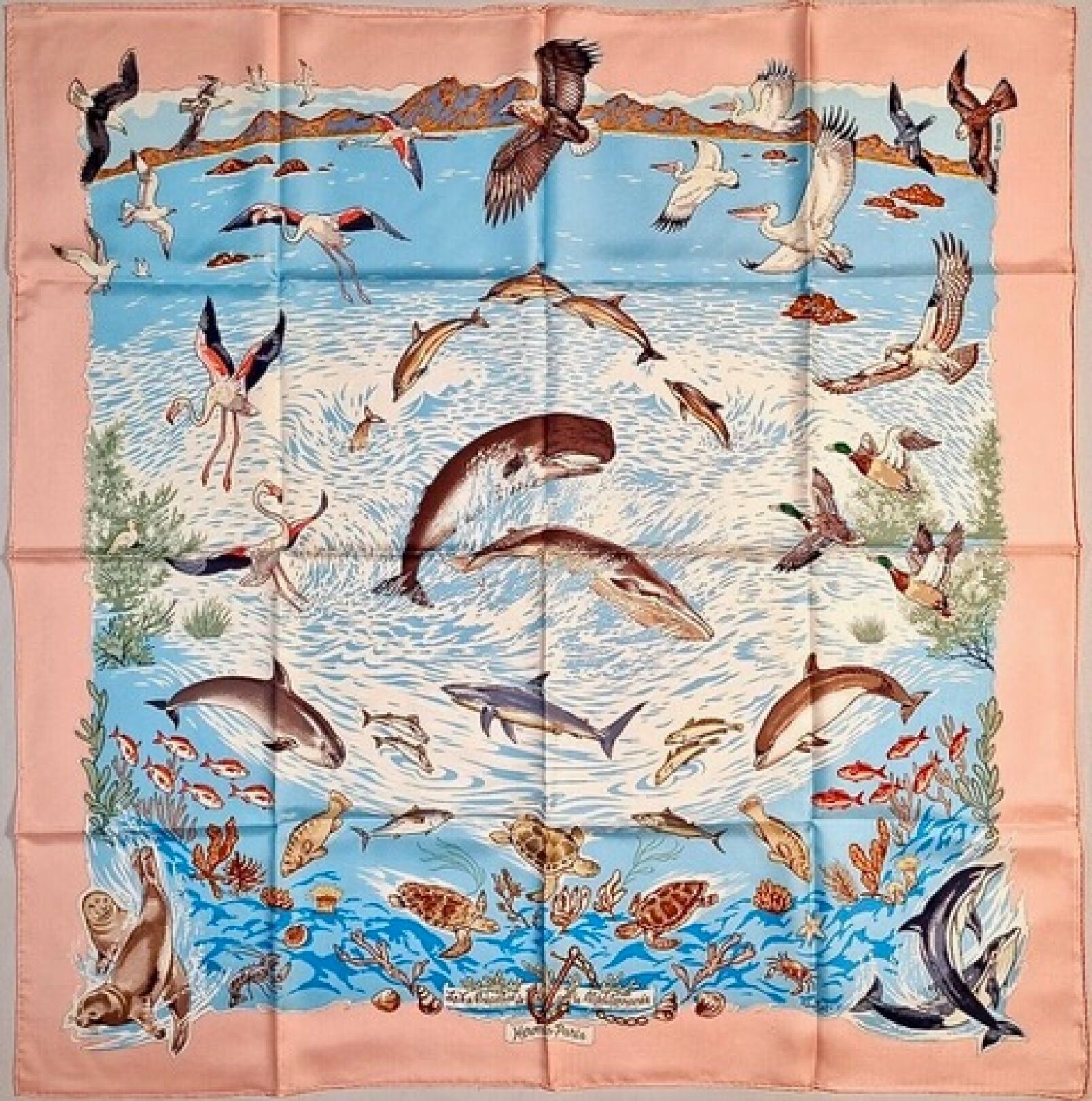 Printed silk twill square titled "La vie précieuse de la Méditerranée", pink border.