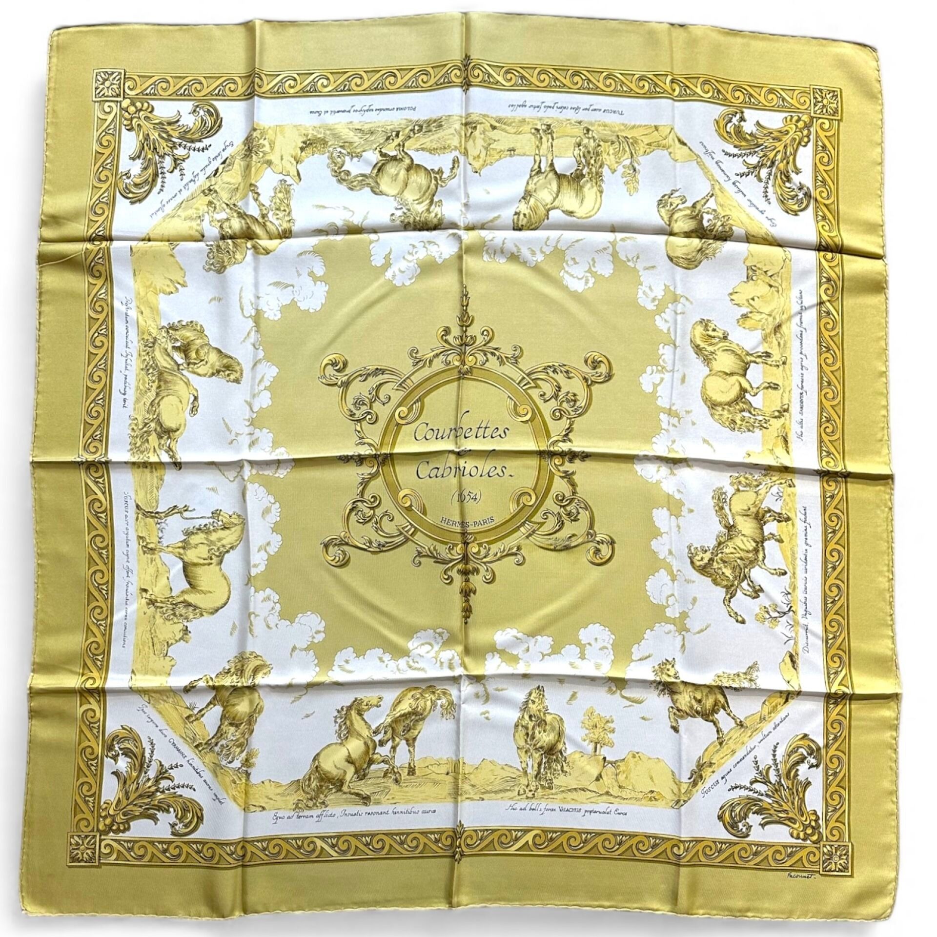Vintage printed silk twill square/scarf titled "Courbettes et Cabrioles - 1654" with gold background and border.