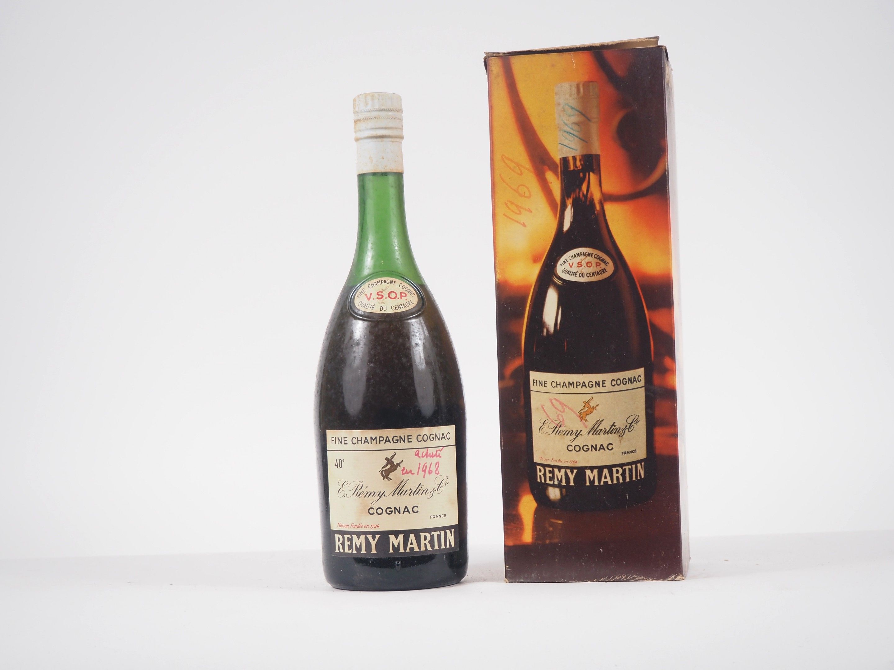 1 BOTTLE COGNAC FINE CHAMPAGNE V.S.O.P. RÉMY MARTIN 70 cl - BOX ABIMÉ/INSCRIPTION MANUSCRITE