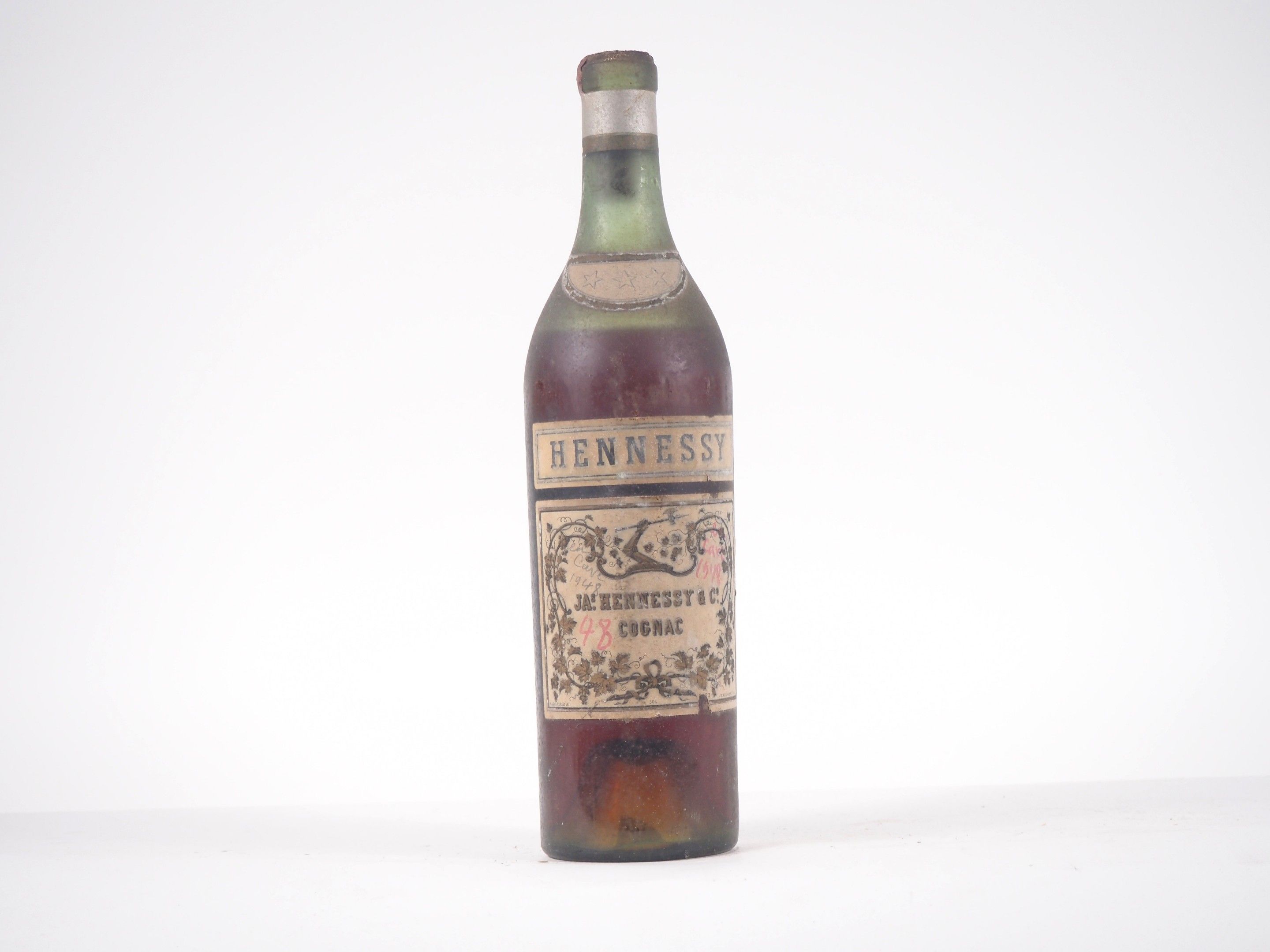1 OLD BOTTLE HENNESSY COGNAC - ES/BS/BOUCHON DESCENDANT/CAPS VERY DAMAGED/MENTION MANUSCRITE SUR L'ÉTIQUETTE