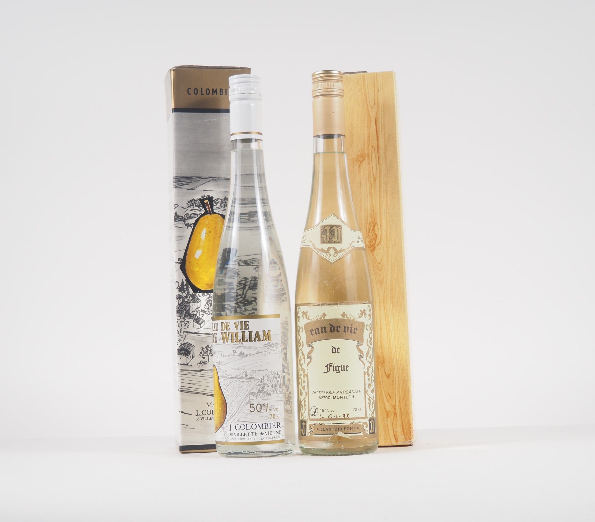 2 BOTTLES : 1 EAU DE VIE DE POIRE WILIAMS J.COLOMBIER 70 cl - 50% - COFFRET/1 EAU DE VIE DE FIGUE JEAN DELPONT 70 cl - 45% - COFFRET