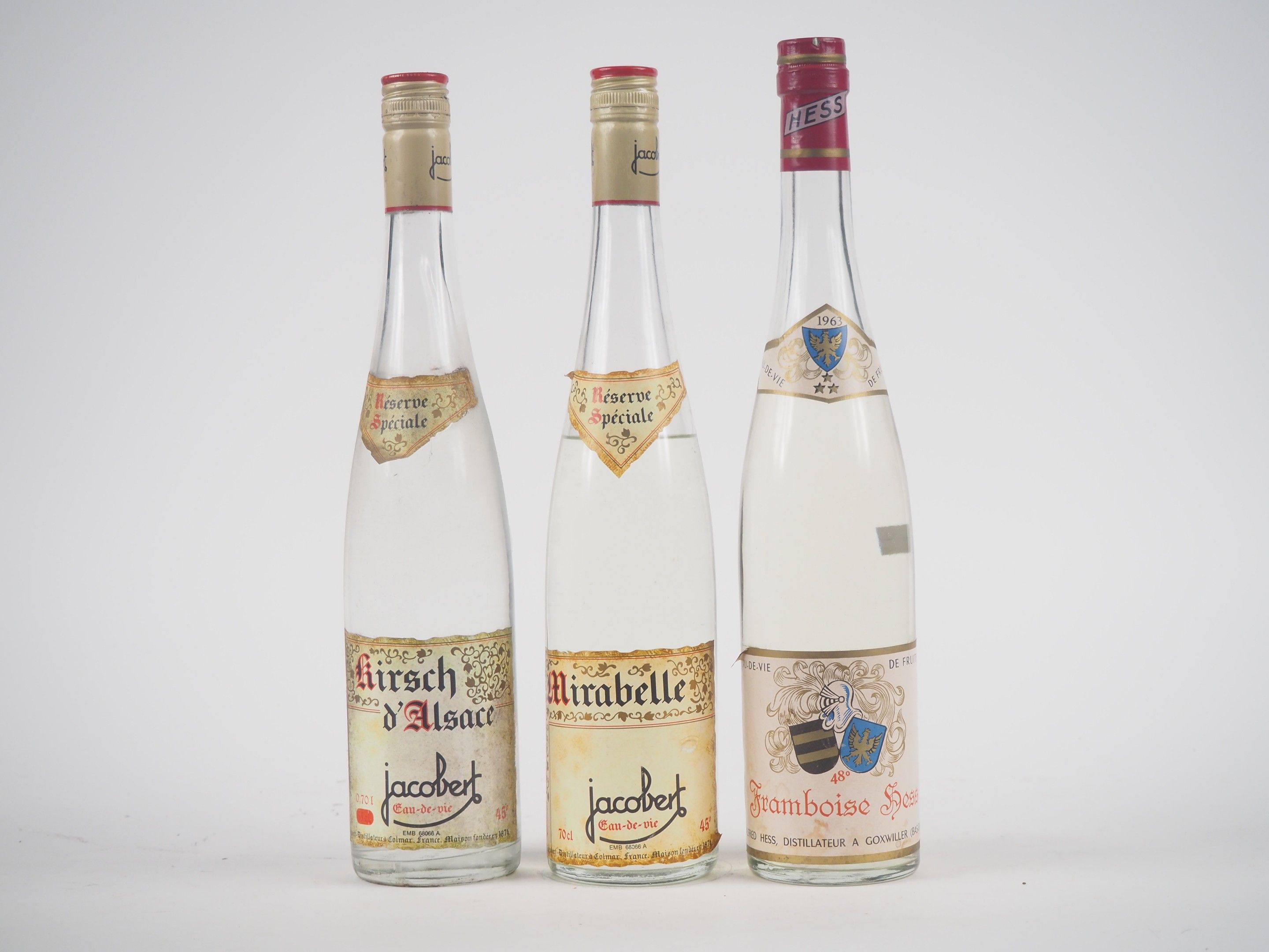 3 BOTTLES: 1 KIRSCH D'ALSACE JACOBERT 70 cl - 45 %/1 MIRABELLE JACOBERT 70 cl - 45 %/1 FRAMBOISE ALFRED HESS 40 % 1963
