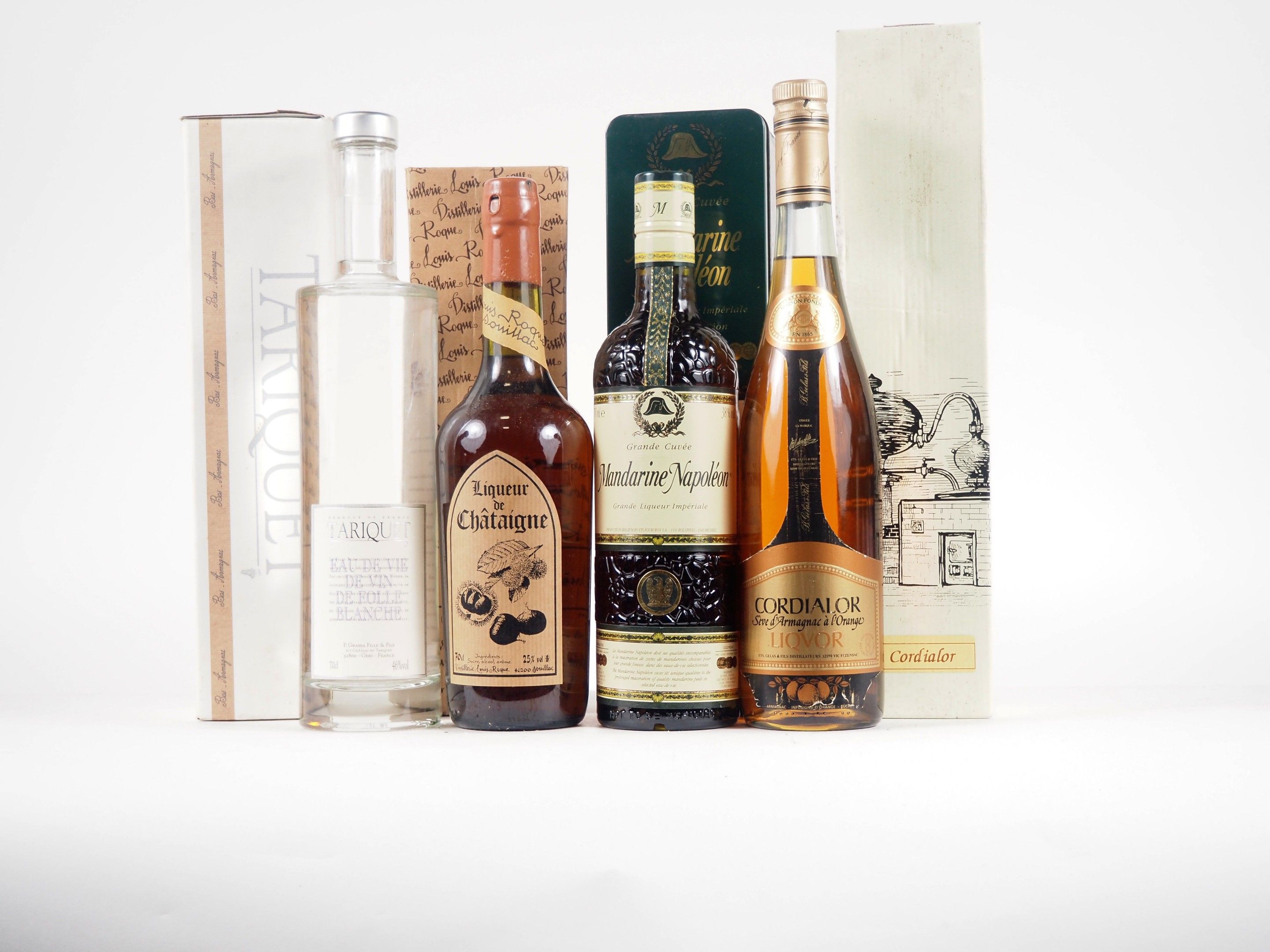 4 BOTTLES: 1 TARIQUET EAU DE VIE DE VIN DE FOLLE BLANCHE 70 cl 46 % - COFFRET/1 LIQUEUR DE CHATAIGNE 70 cl - 25 % - COFFRET/1 MANDARINE NAPOLÉON GRANDE LIQUEUR IMPÉRIALE GRANDE CUVÉE 70 cl - 38 %/1 SÈVE D'ARMAGNAC À L'ORANGE CORDIALOR 70 cl - 35