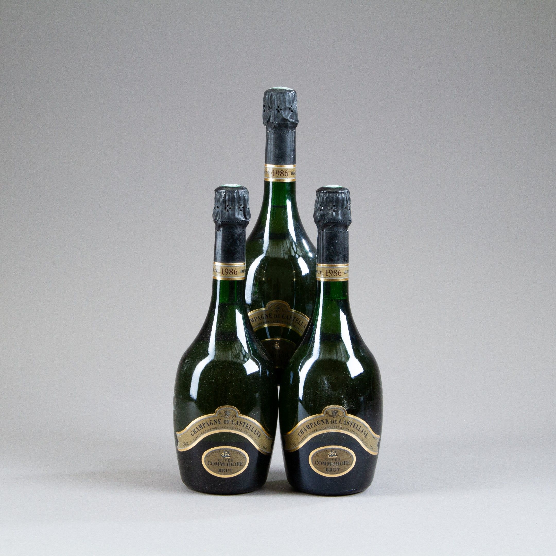 3 bottles CHAMPAGNE "Cuvée Commodore Brut" de Castellane 1986 (in individual case).
