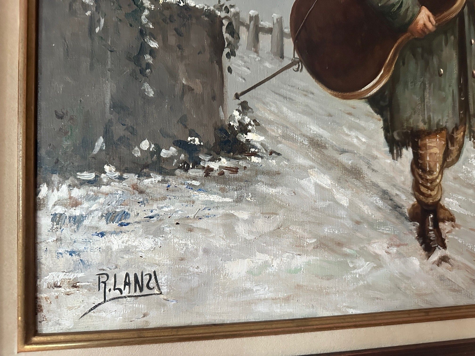 R. LANZI (XXe) Musicien sous la neige - HST signed - 48 x 69 cm *** sale following an inheritance this lot is to be IMPERATIVELY AND DIRECTLY collected in the house centre town of Rodez on Monday 1st December at 8H30 on presentation of the receipted invoice*** - ref 32793