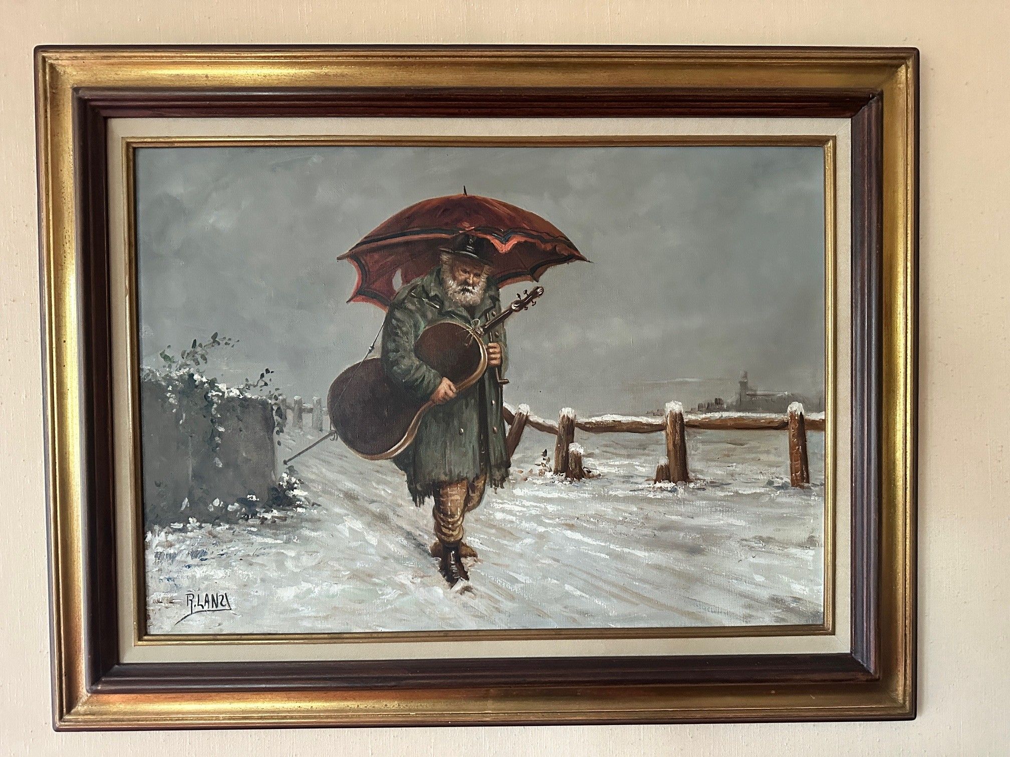 R. LANZI (XXe) Musicien sous la neige - HST signed - 48 x 69…