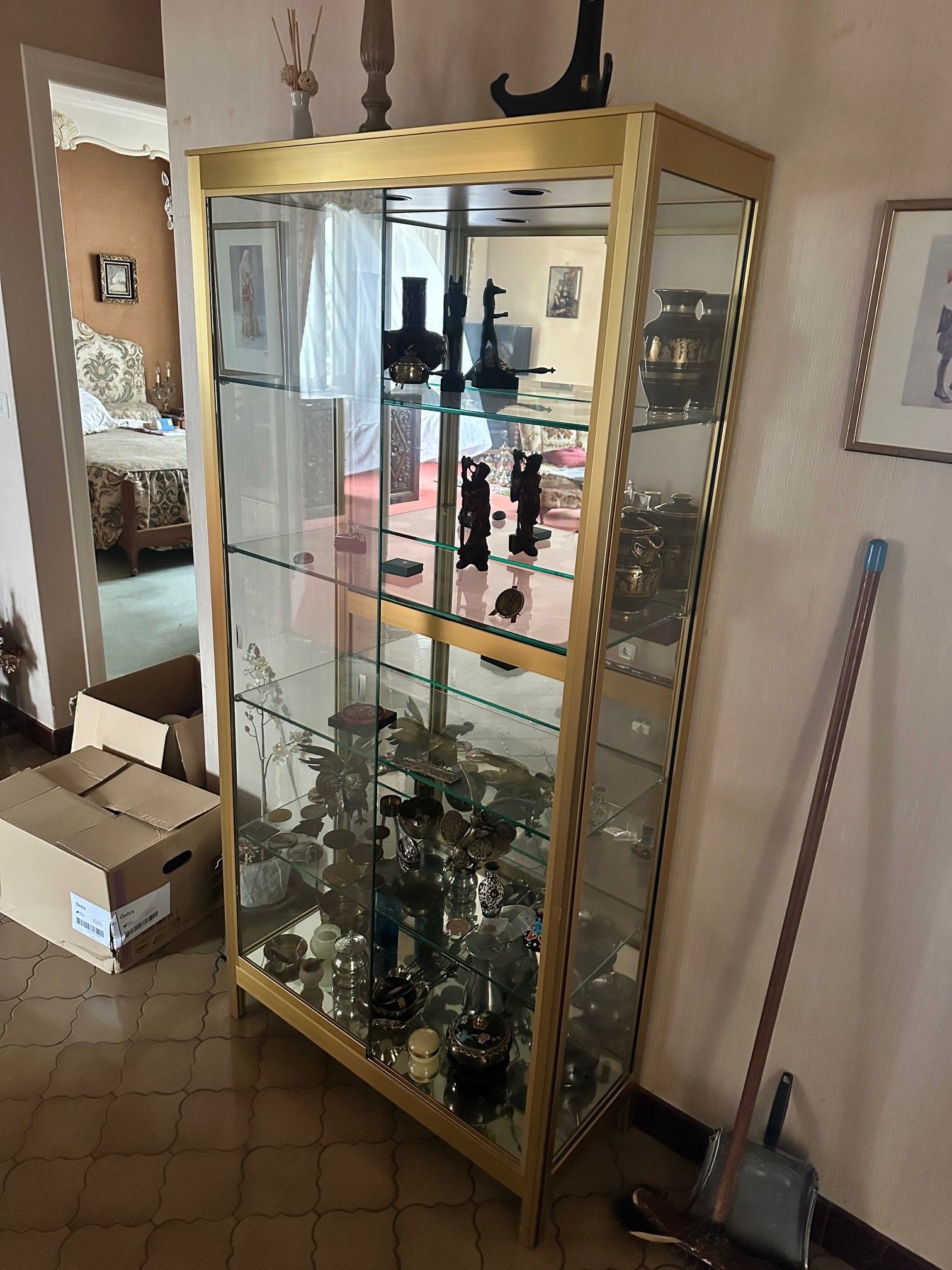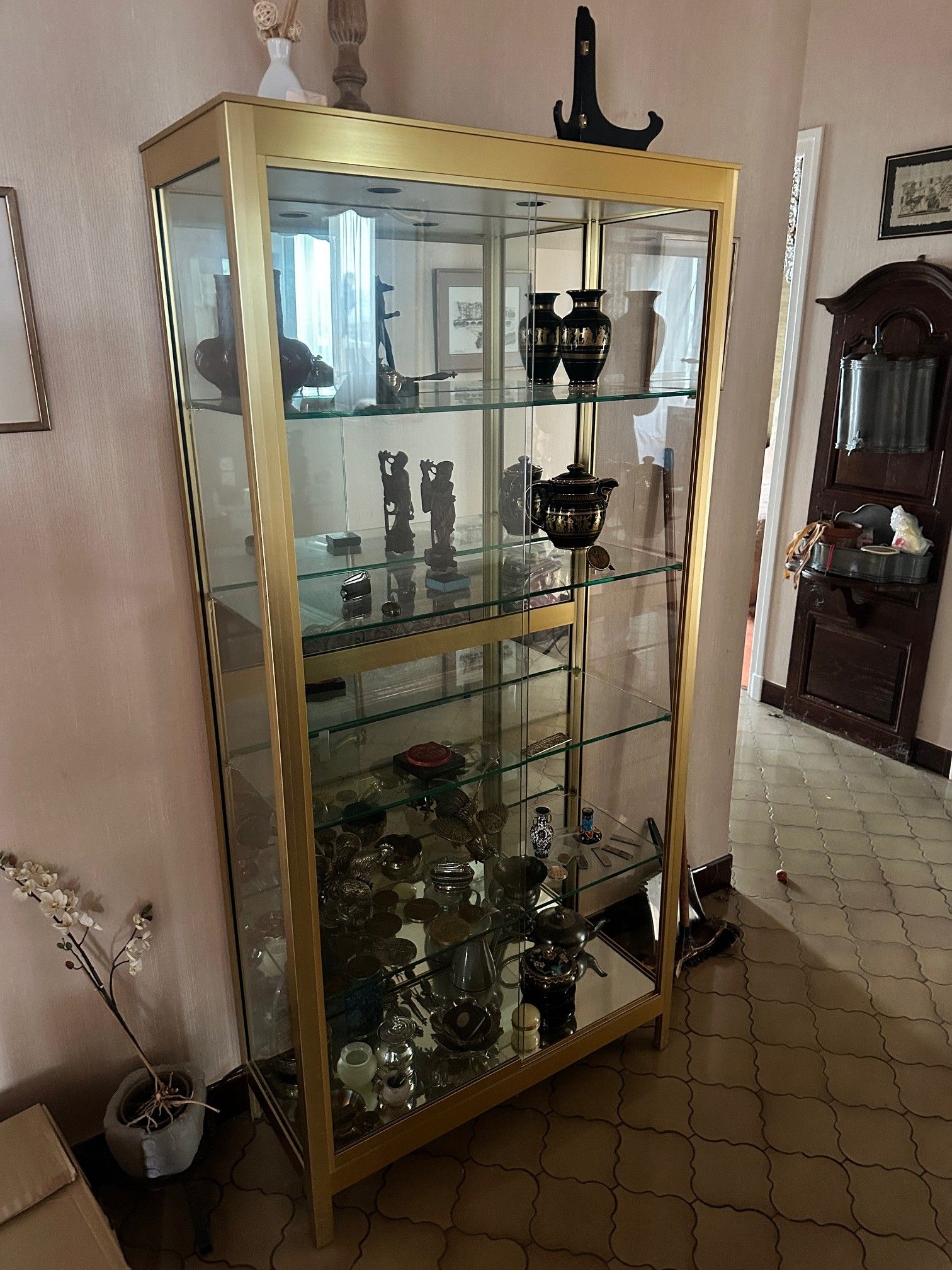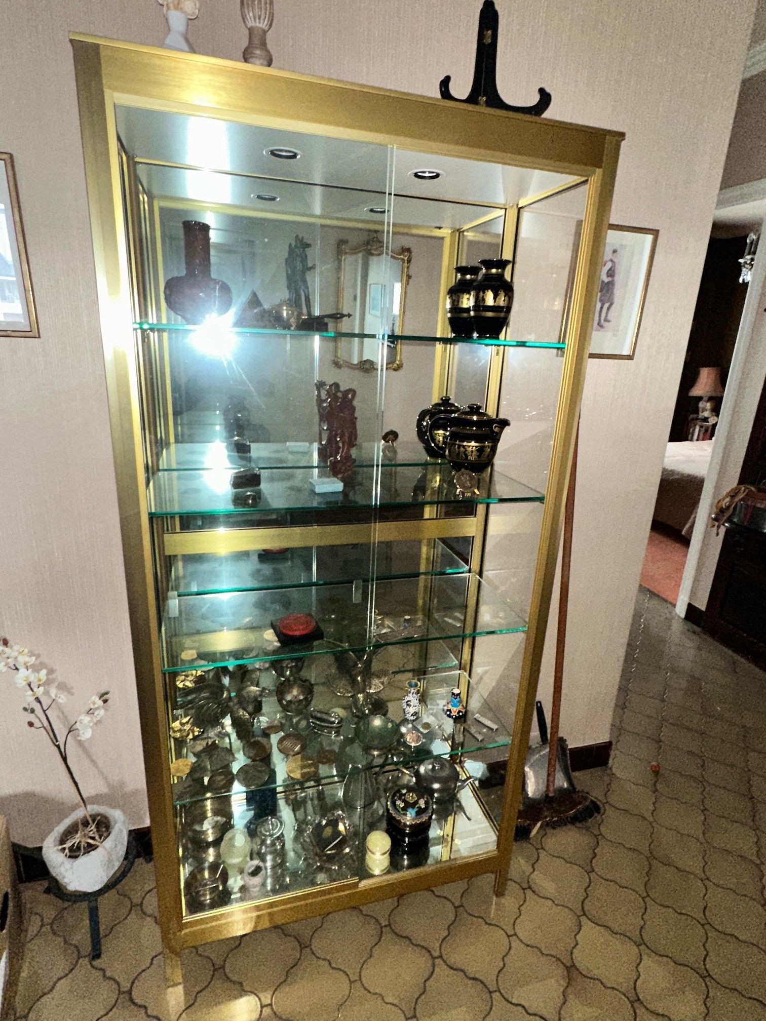 Rectangular display case with 3 glazed sides - illuminated - gilded metal structure - opening with 2 sliding doors - quality workmanship - circa 1980/1990 - 176 x 85 x 35 cm *** sale following an inheritance this lot is to be COLLECTED DIRECTLY AND IMPERATIVELY in the house in the town centre of Rodez on Monday 1 December at 8.30 am on presentation of the paid invoice*** - ref 32793