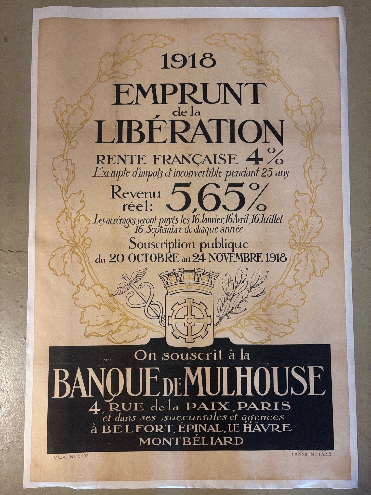 Canvas poster - EMPRUNT de la LIBERATION, Rente Française 4%, - Souscription publique du 20 octobre au 24 novembre 1918, On souscrit à la BANQUE DE MULHOUSE (68), 4 rue de la Paix, à Paris et dans ses succursales et agences à BELFORT (90), EPINAL (88), LE HAVRE (76), MONTBLIARD (25) ". Lithographed and printed in colour by Lapina, Paris - 120 x 80 cm - Ref. 32752 -51