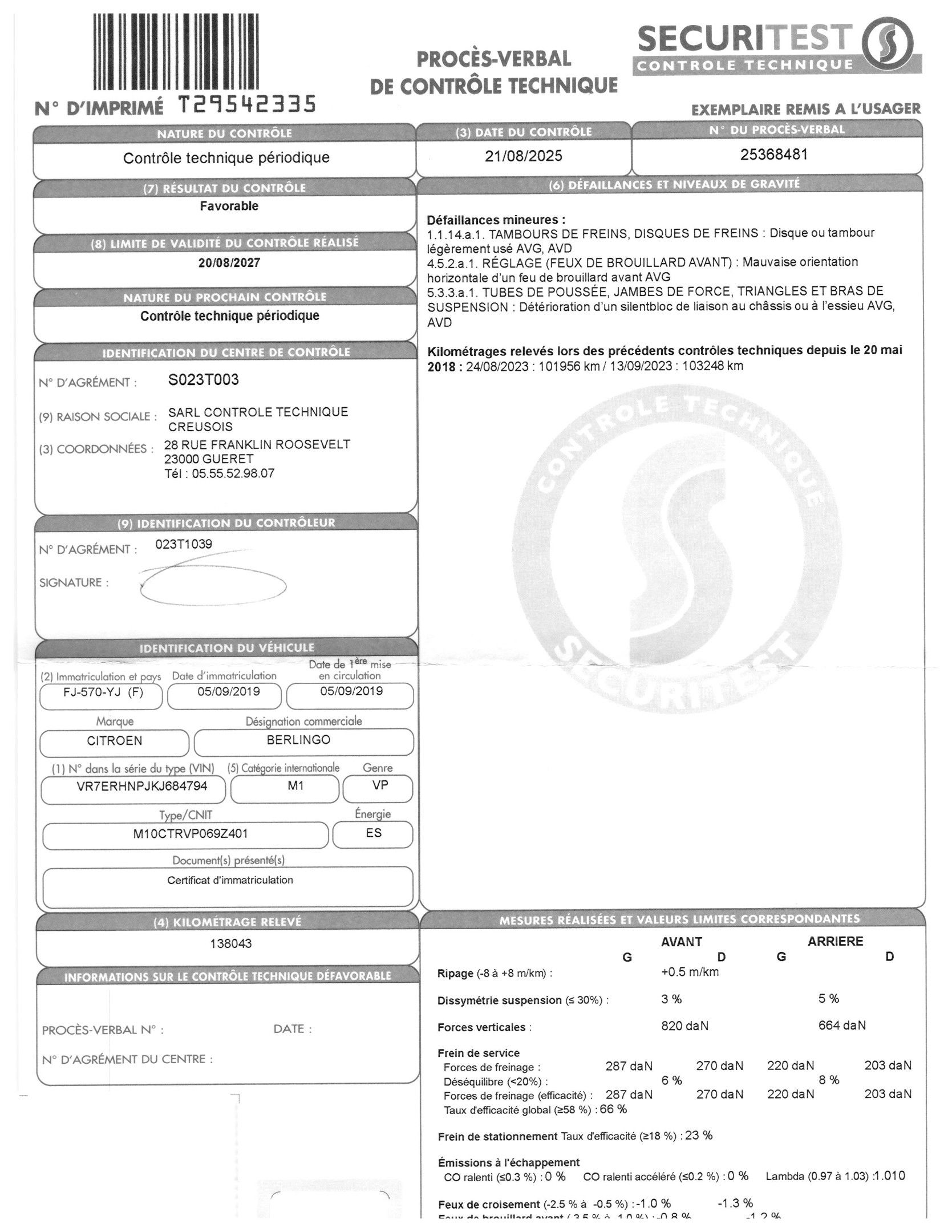 Private car CITROEN Berlingo Break M 1.2 PureTech 12V GPF S&S 110 cv, registered FJ-570-YJ, 1st registered on 05/09/2019, type VP, body CI, energy : petrol, 6 cv fiscaux, 139640kms. Sold with registration, MOT and 2 keys. Service invoices