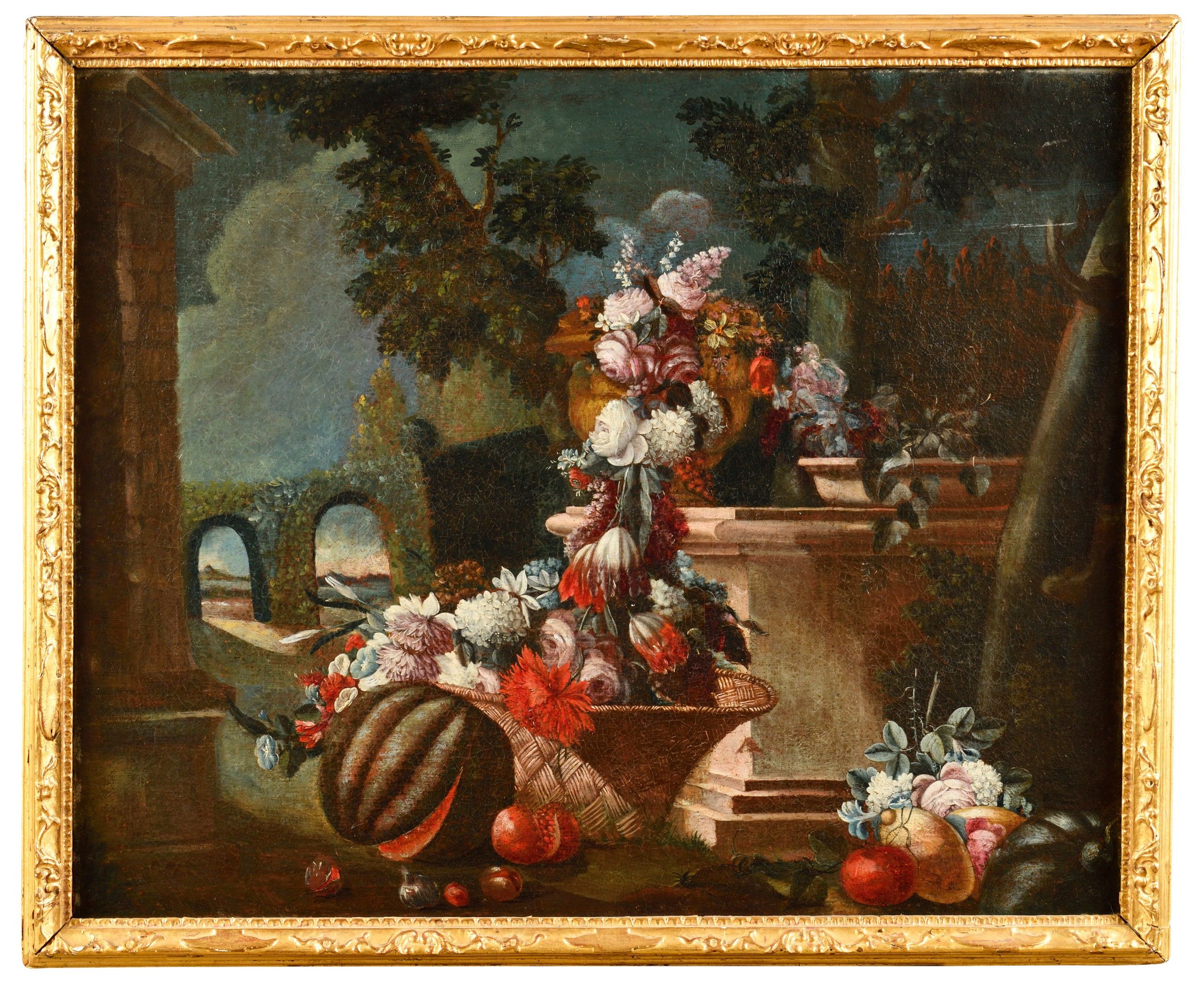 Premium 18th century ITALIAN SCHOOL Garlands of flowers on an entabl…