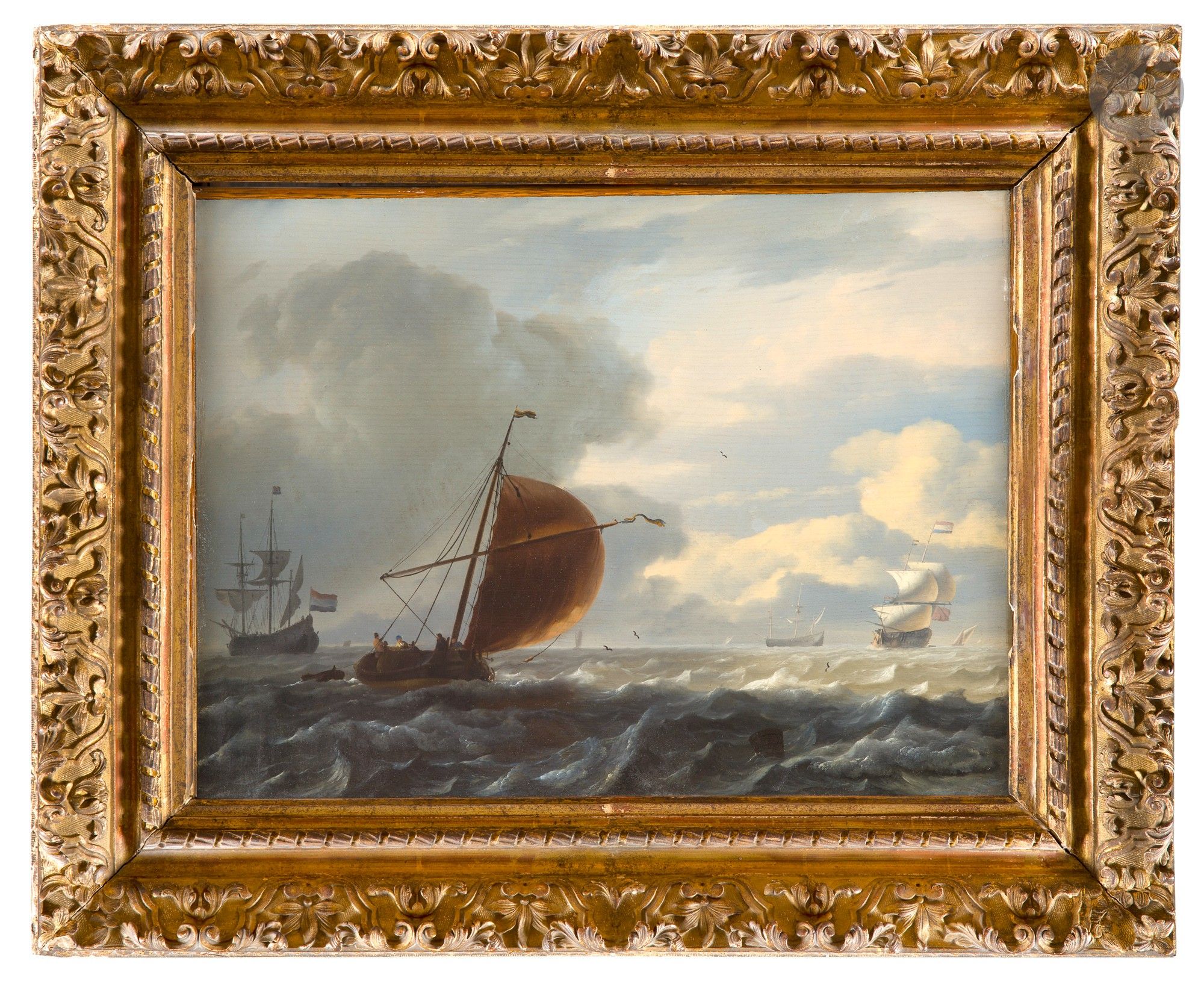 Bears the Martinet sale label on the reverse of the panel and a blue label with no. 493 and a label on the reverse of the frame "Backhuisen Marine".