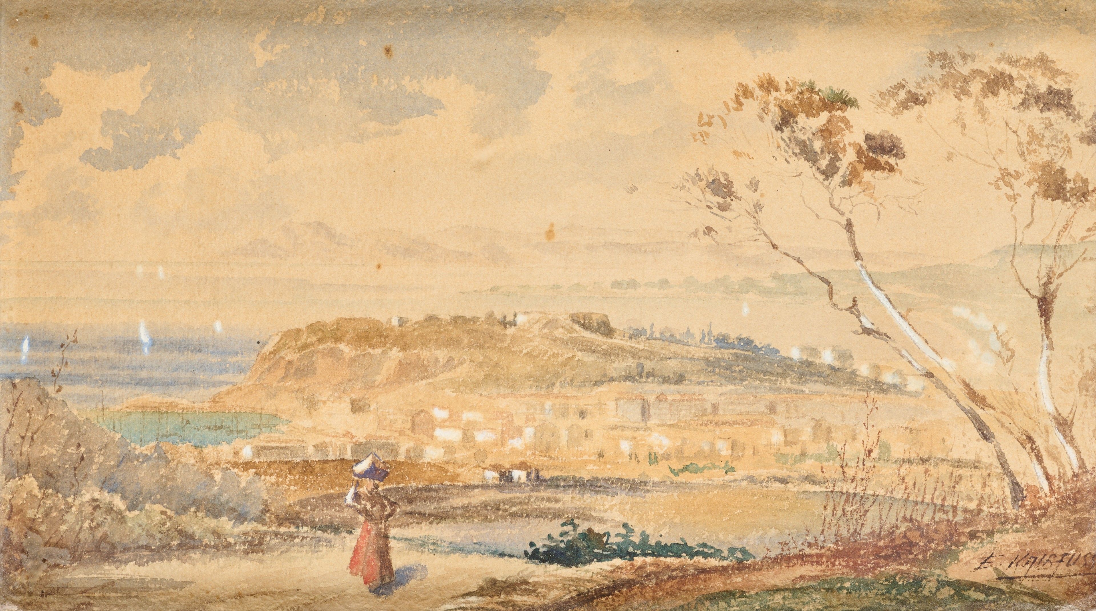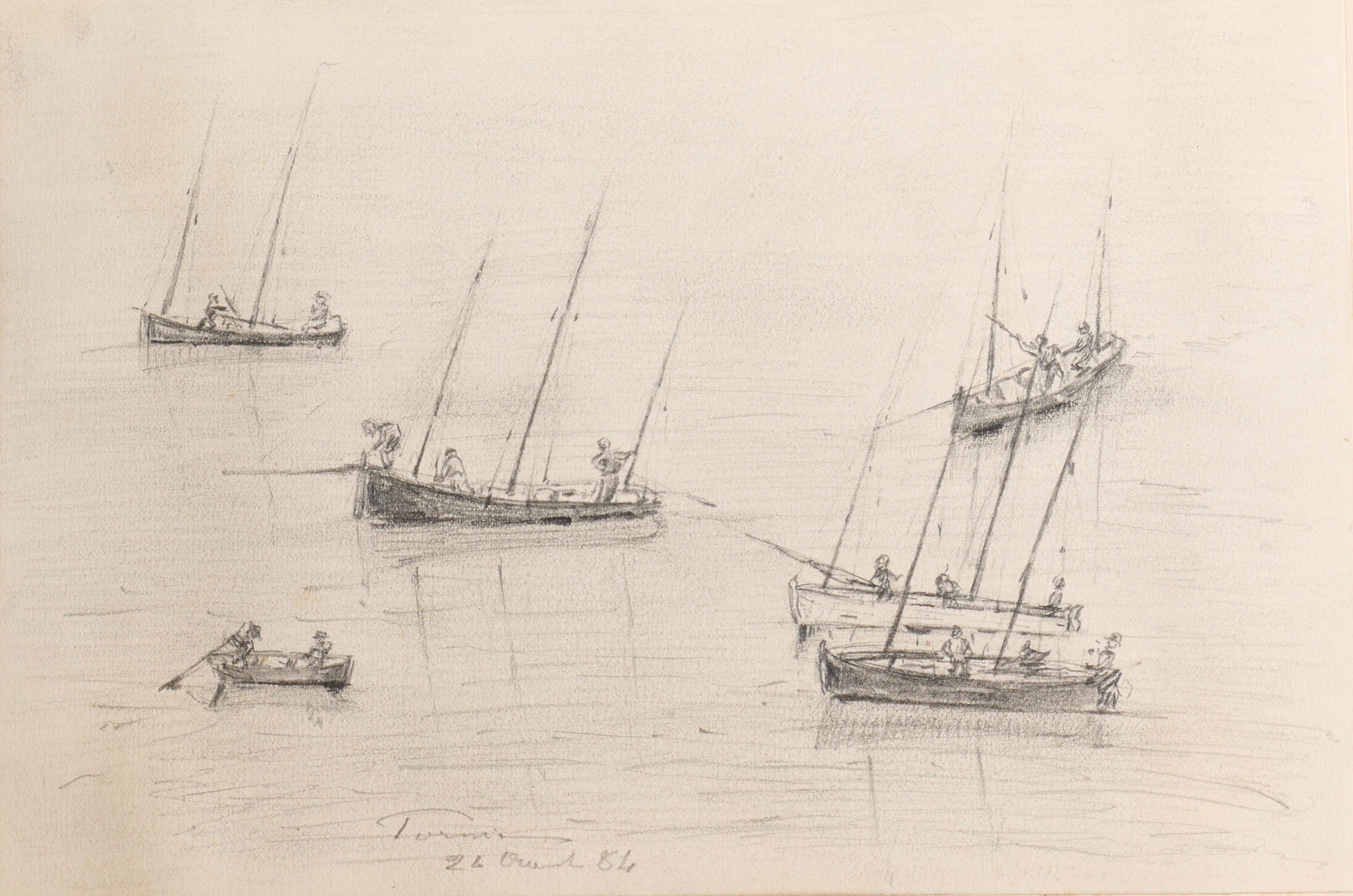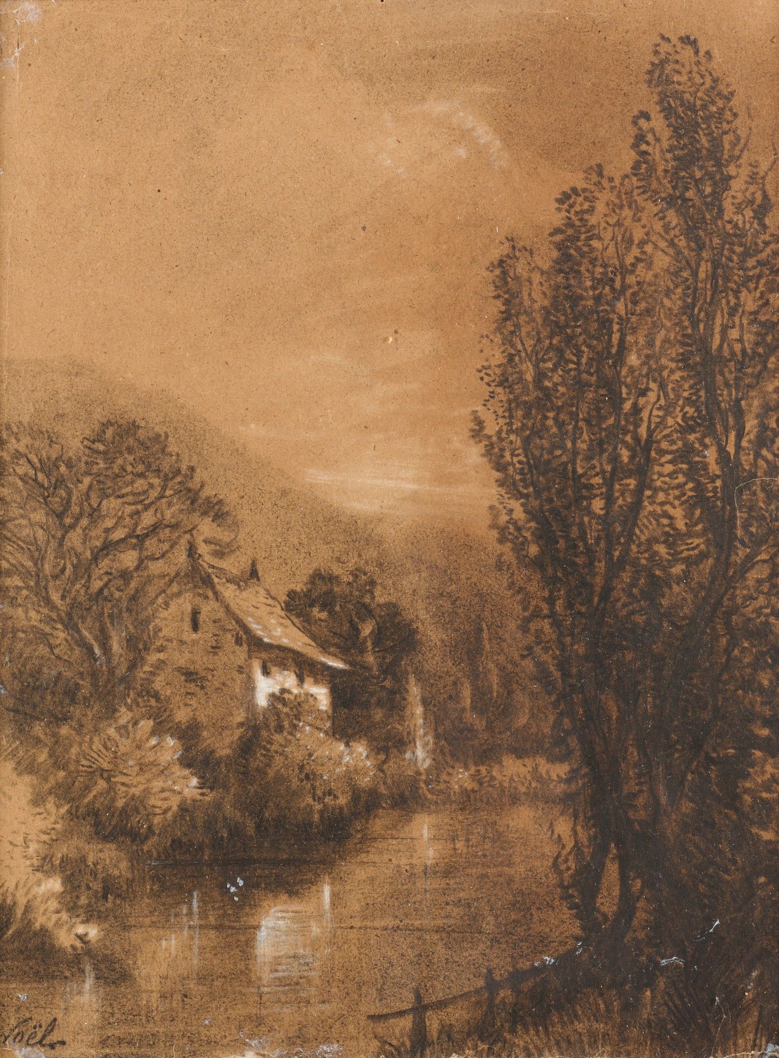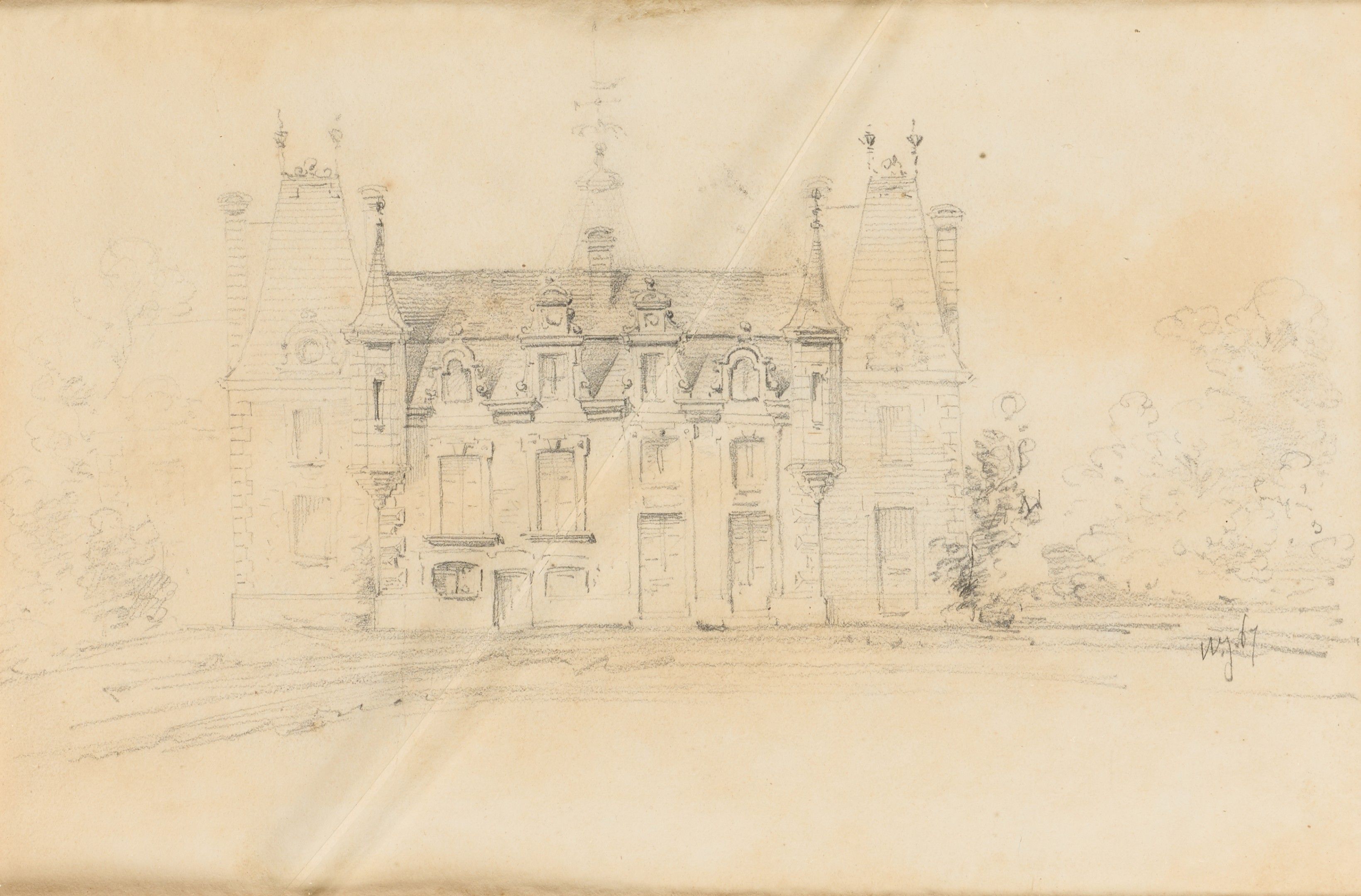 Album containing twenty - eight drawings: Vues de Pornic, Vues de Boulogne, Une voiture à cheval, Deux paysages, Un portrait, Un château, Scènes familiales