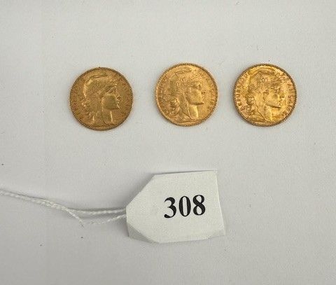 3 gold coins Rooster, 1 of 1902, 1 of 1906, 1 of 1909, Pb: 19,4 gr